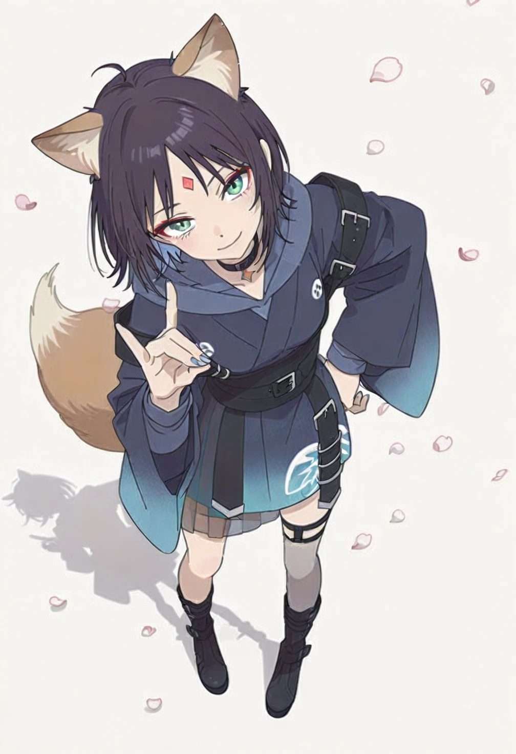 Sakayori Iroha,green eyes,red eyeshadow,black hair,short hair,multicolored hair,two-tone hair,colored inner hair,ahoge,parted bangs,ch4 animal ears,ch4 fox girl,ch4 fox ears,ch4 animal ear fluff,ch4 extra ears,ch4 fox tail,ch4 tail,ch4 facial mark,ch4 forehead mark,ch4 forehead jewel,ch4 kimono,ch4 japanese clothes,ch4 black belt,ch4 asymmetrical skirt,ch4 see-through skirt,ch4 pleated skirt,ch4 hoodie,ch4 hood,ch4 hood down,ch4 choker,ch4 black choker,ch4 long sleeves,ch4 wide sleeves,ch4 nail polish,ch4 light blue nails,ch4 single thigh strap,ch4 single thighhigh,ch4 fishnet thighhigh,ch4 suspenders,ch4 boots,ch4 black footwear,ch4 knee_boots,costume5