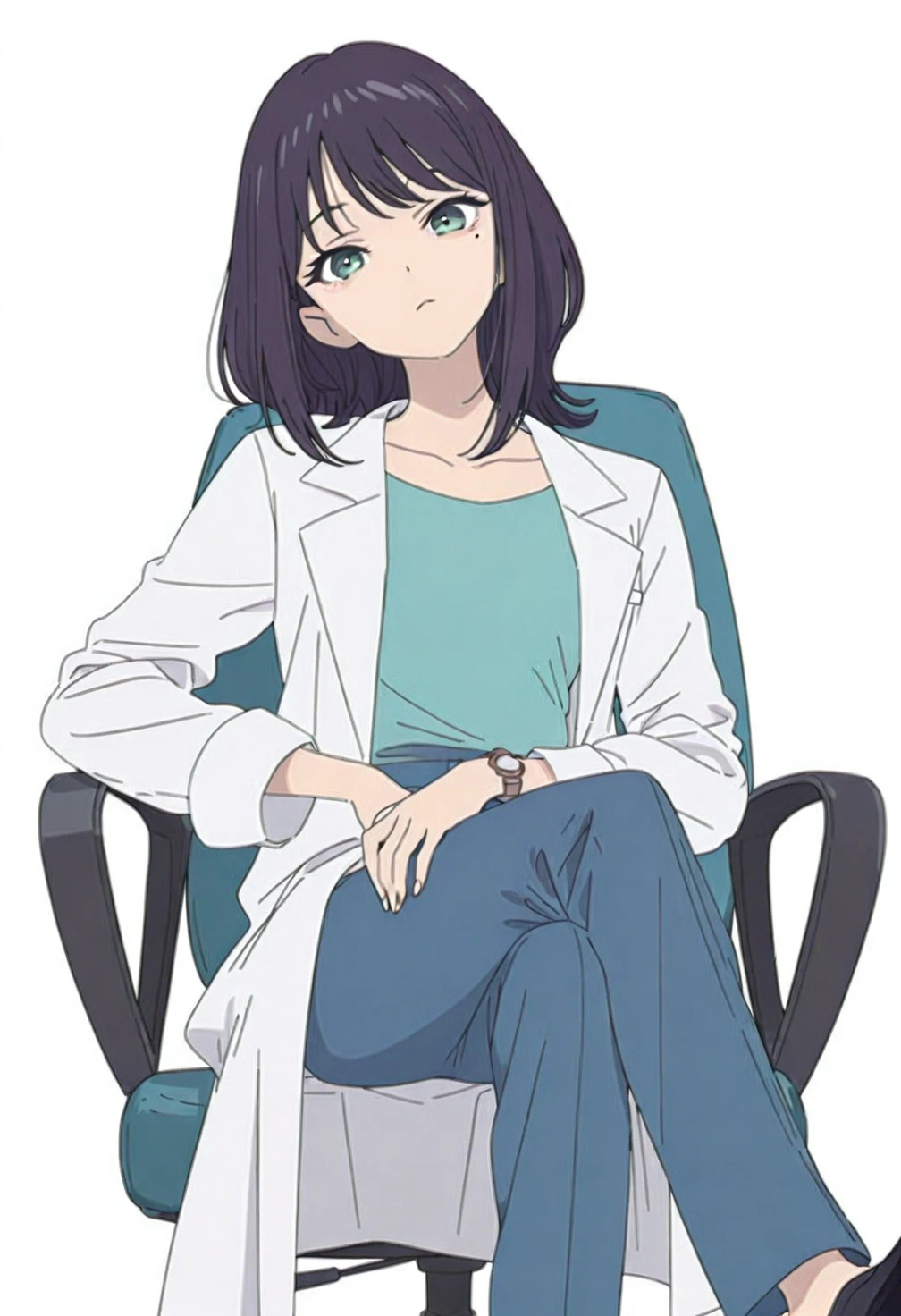 Sakayori Iroha,green eyes,black hair,medium hair,sidelocks,bangs,mole,mole under eye,collarbone,ch11 teal shirt,ch11 white lab coat,ch11 pocket,ch11 wristwatch,ch11 blue pants,ch11 high heels,ch11 black footwear,costume12