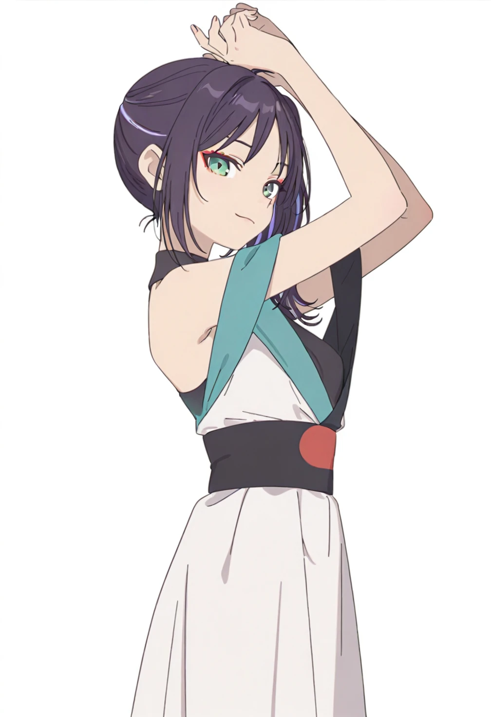 Sakayori Iroha,green eyes,red eyeshadow,purple hair,short hair,ahoge,multicolored hair,two-tone hair,streaked hair,side ponytail,ch7 yellow hair tie,ch7 bare shoulders,ch7 off shoulder,ch7 black sleeveless shirt,ch7 white dress,ch7 sleeveless dress,ch7 sash,ch7 mary janes,ch7 black footwear,ch7 platform footwear,costume8