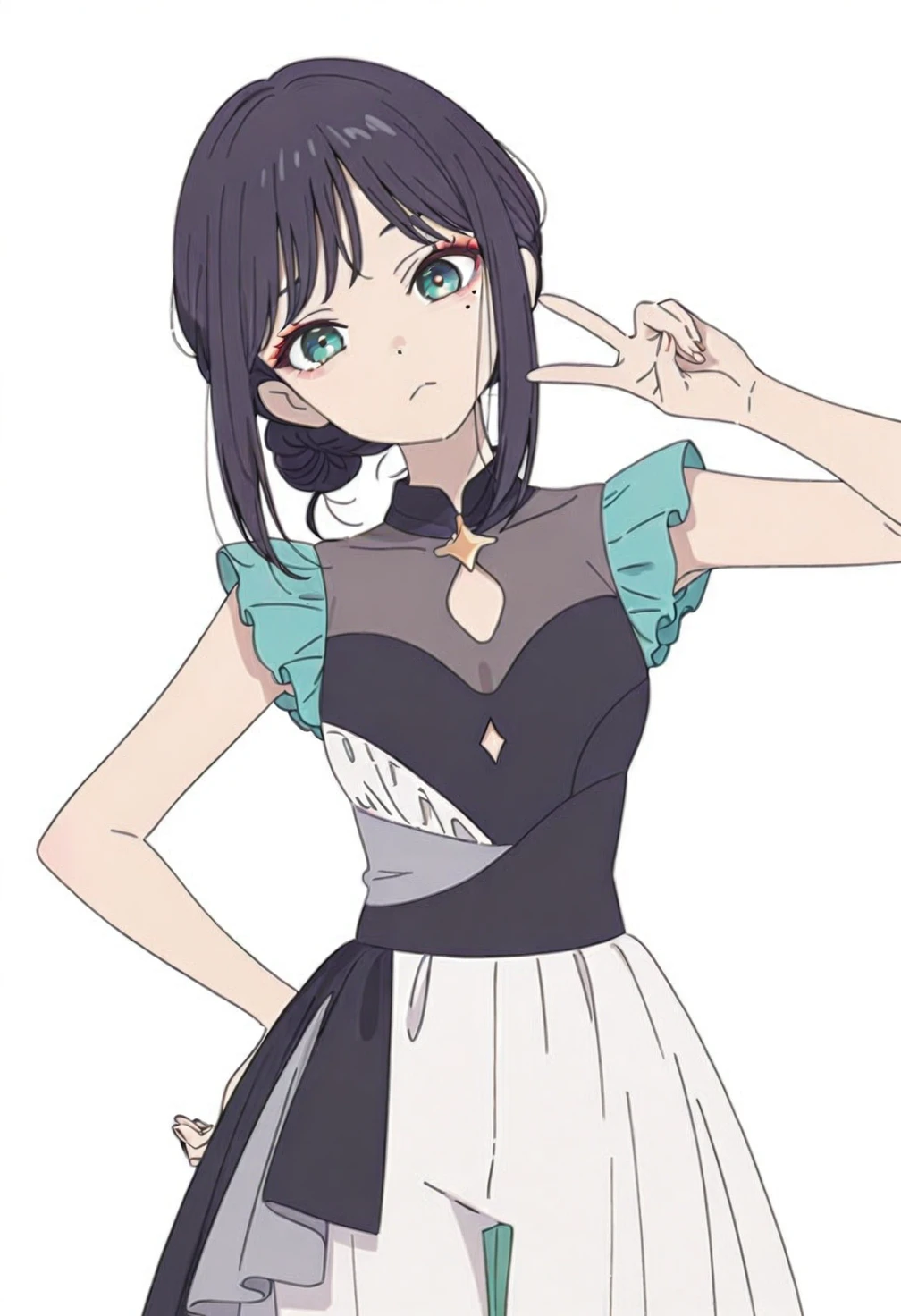 Sakayori Iroha,green eyes,red eyeshadow,black hair,short hair,sidelocks,hair bun,single hair bun,bangs,mole,mole under eye,ch12 idol clothes,ch12 sleeveless dress,ch12 cleavage cutout,ch12 frills,ch12 pants under dress,ch12 white pants,ch12 bell-bottom pants,ch12 high heels,ch12 black footwear,costume13
