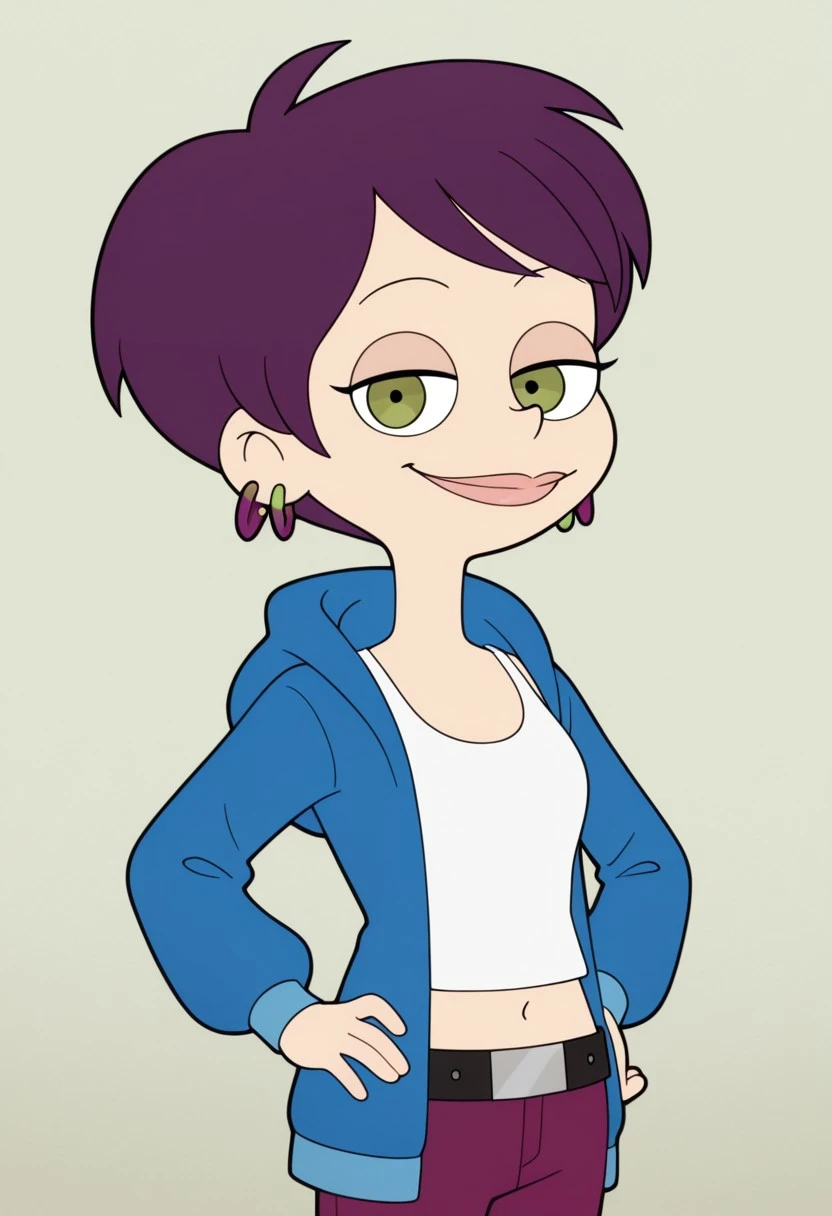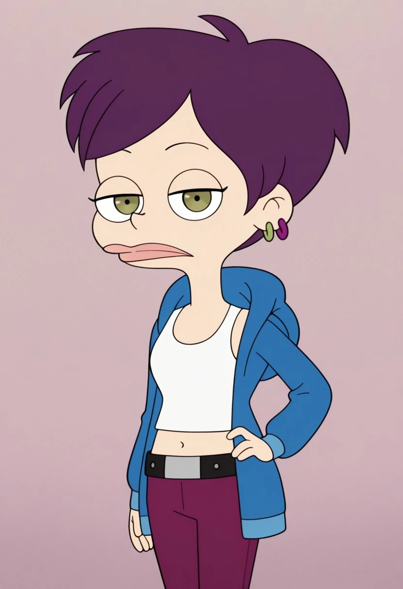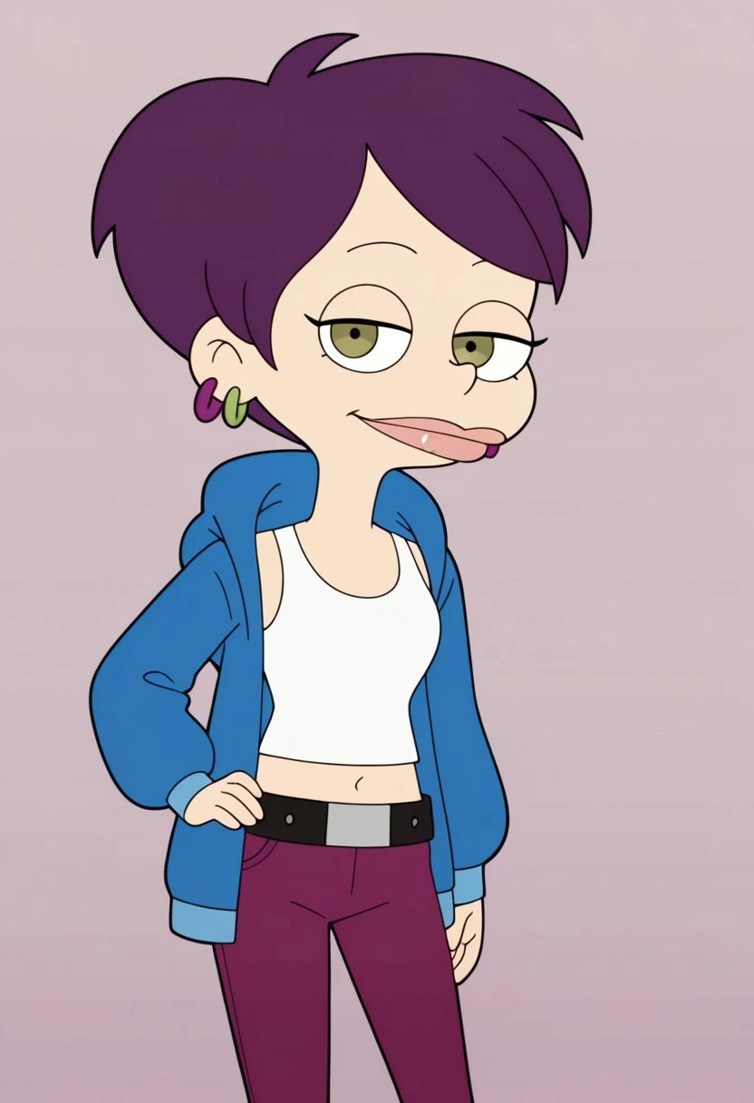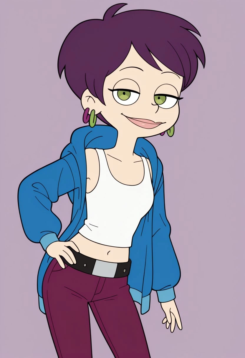 Tallulah_Levine, 1girl, solo, violet hair, short hair, 2 hoop earrings in one ears, violet and green 2 hoops earrings, green eyes, lipstick, black eyeshadow, makeup