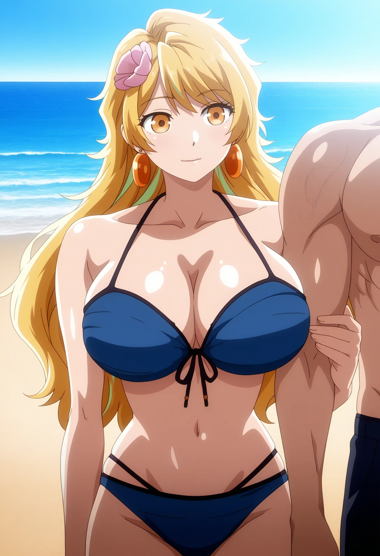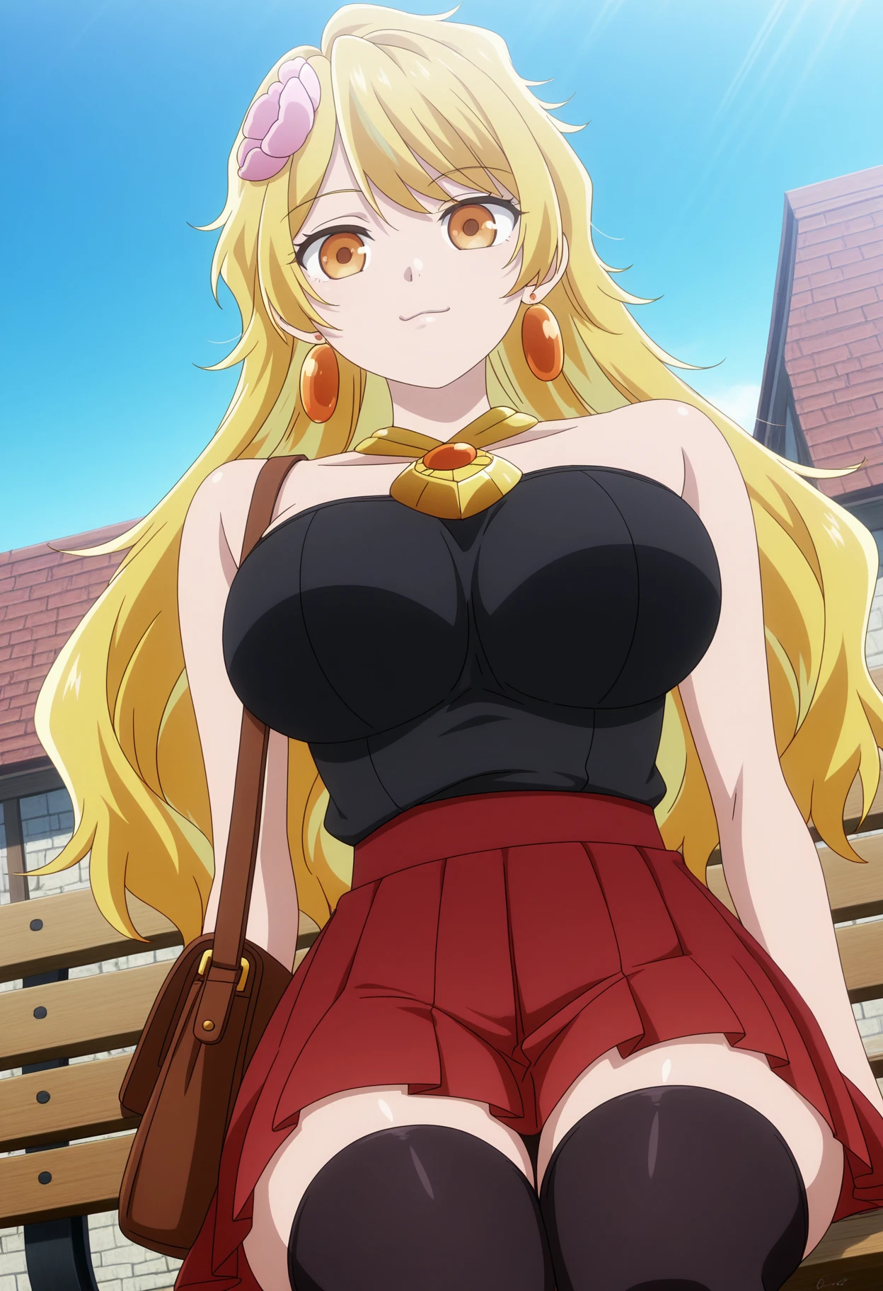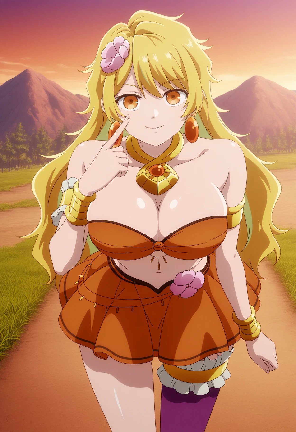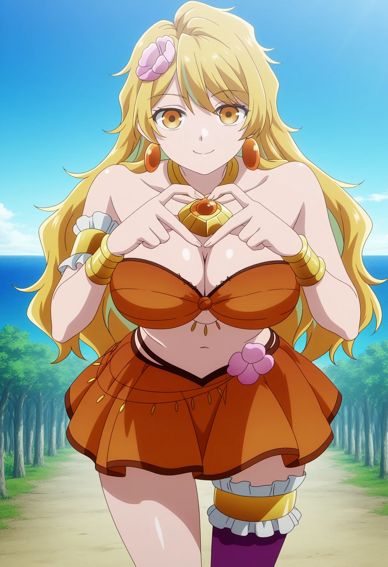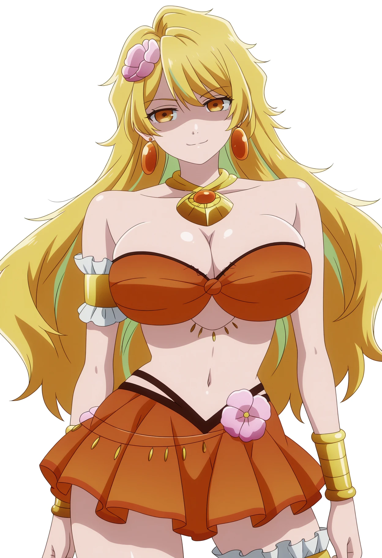 goawz, long hair, multicolored hair, blonde hair, hair flower, orange eyes, earrings, large breasts, strapless bra, orange bandeau, orange skirt, miniskirt, bracelet, armlet, asymmetrical legwear, frilled thigh strap, midriff, bare shoulders, necklace, uneven legwear, purple tighhigh, single thighhigh
