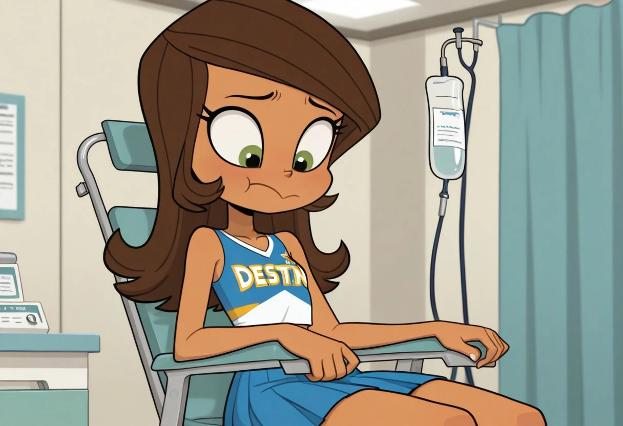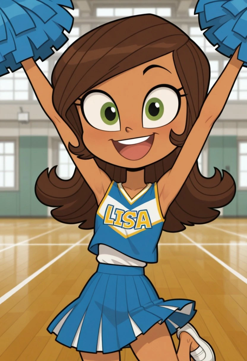 1girl, solo, lisa_bancroft, dark skin, green eyes, brown hair, long hair, blue cheerleading top with design, blue cheerleading skirt, white flat shoes