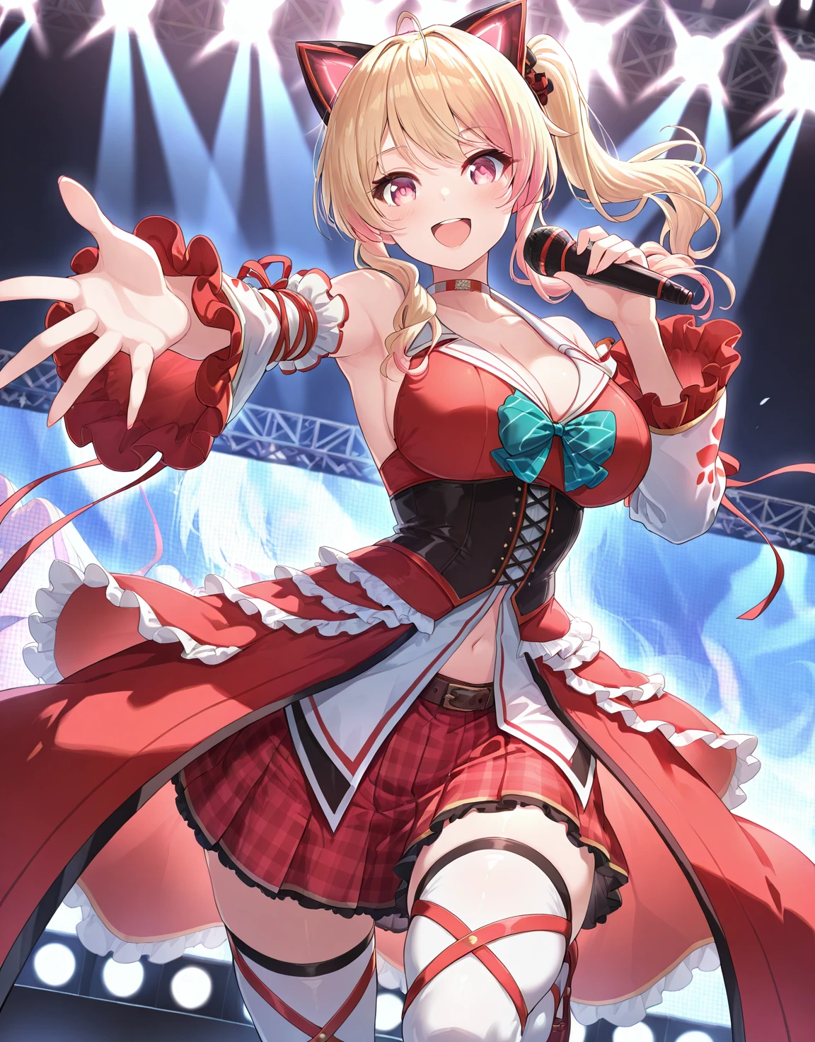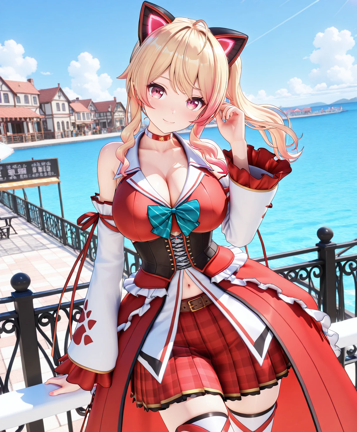 NekonokiMochiDress, side ponytail, fake cat ears, choker, sleeveless dress, detached sleeves, plaid skirt, thighhighs, tail,