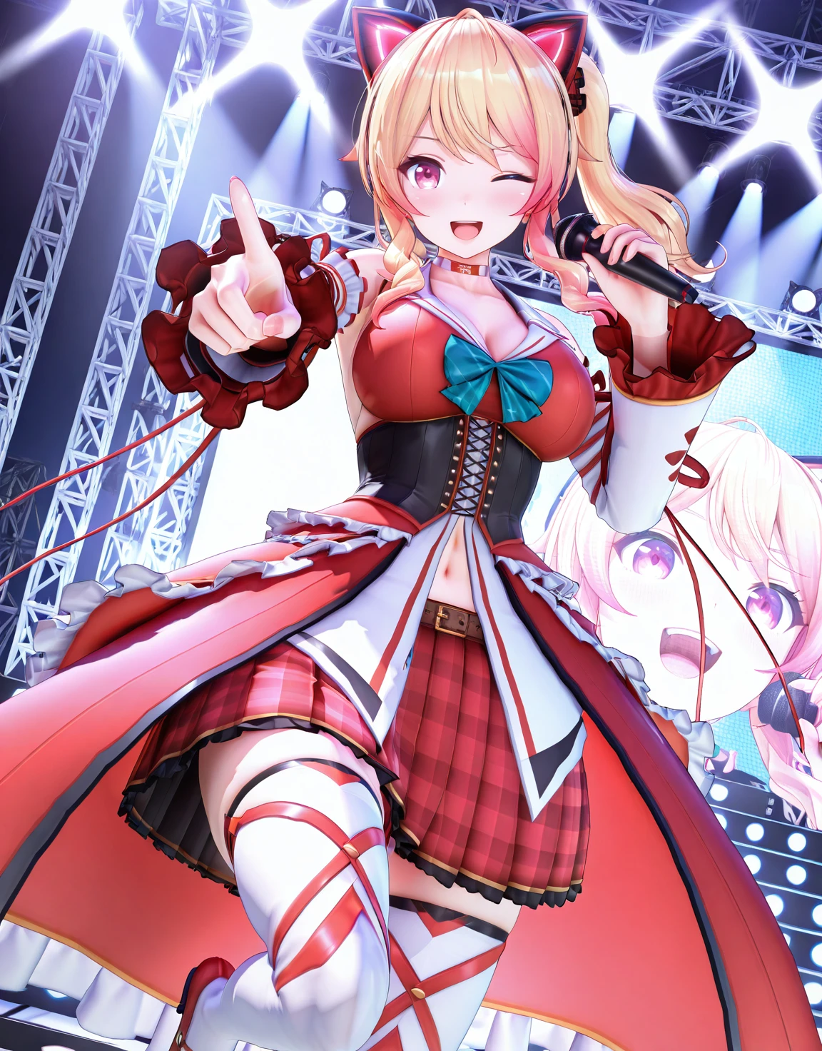 NekonokiMochiSchool, side ponytail, fake cat ears, white shirt, plaid skirt, thighhighs, loafers,