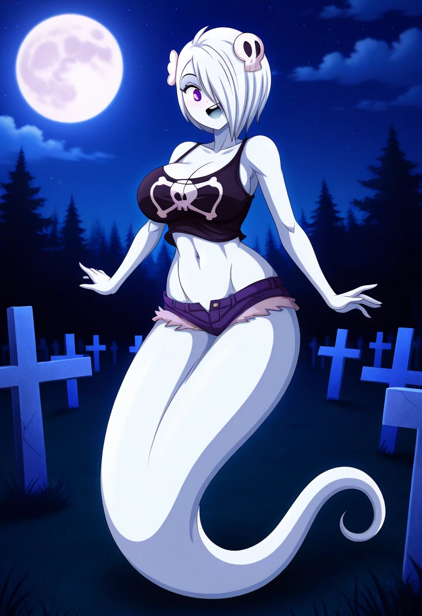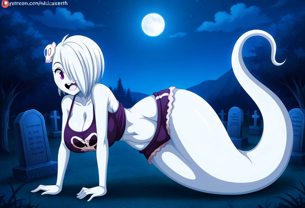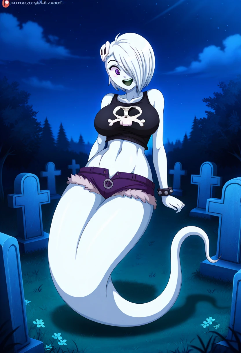 Carrie_Krueger_AlcasarReich, ghost girl, (ghost tail), 1girl, white skin, white hair, short hair, hair over one eye