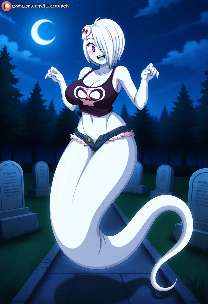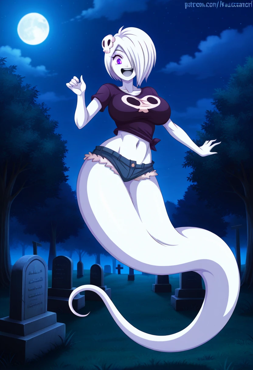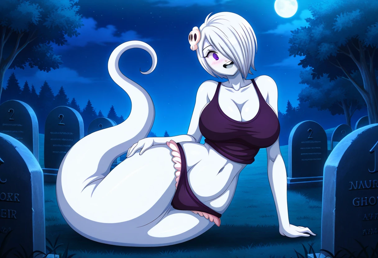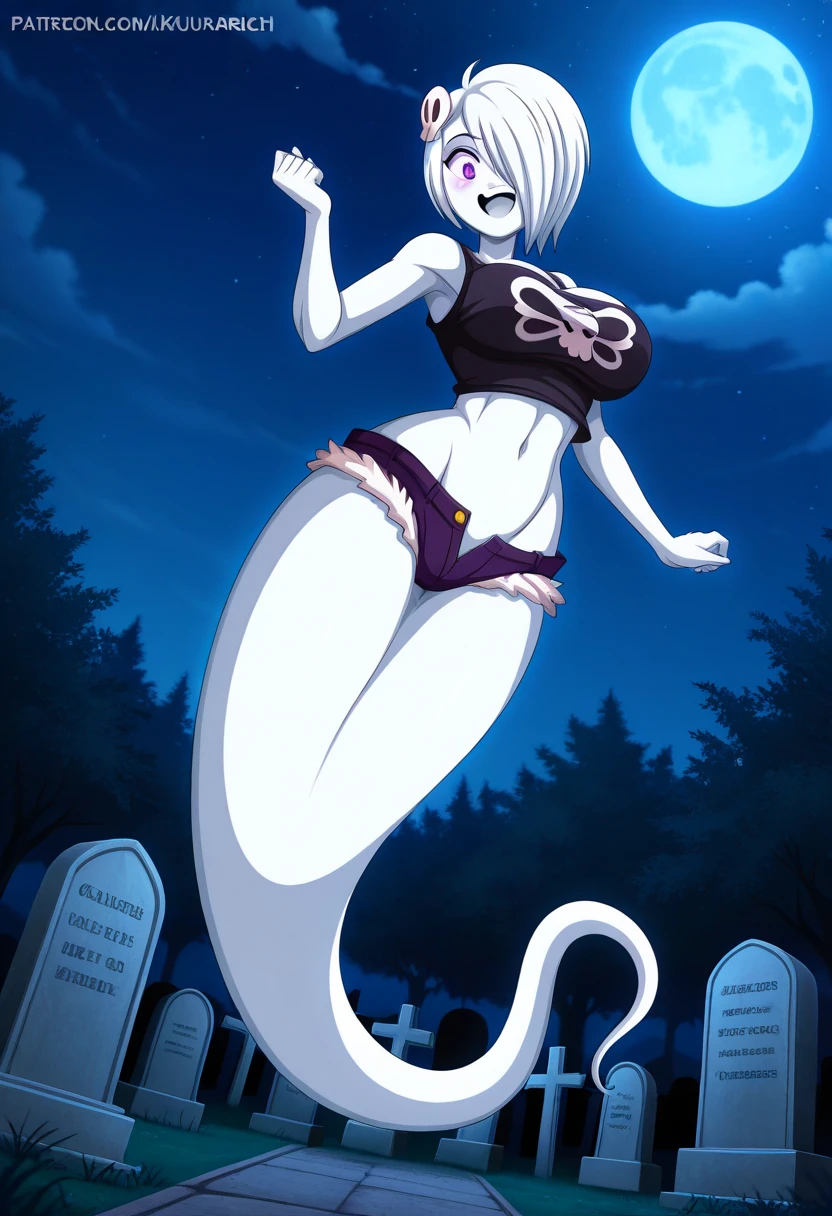 Carrie_Krueger_AlcasarReich, ghost girl, (ghost tail), 1girl, white skin, white hair, short hair, hair over one eye