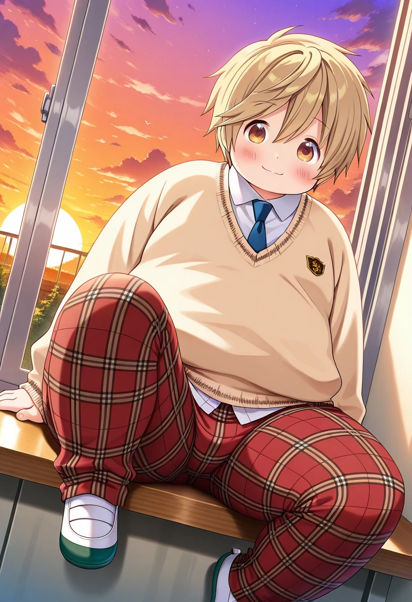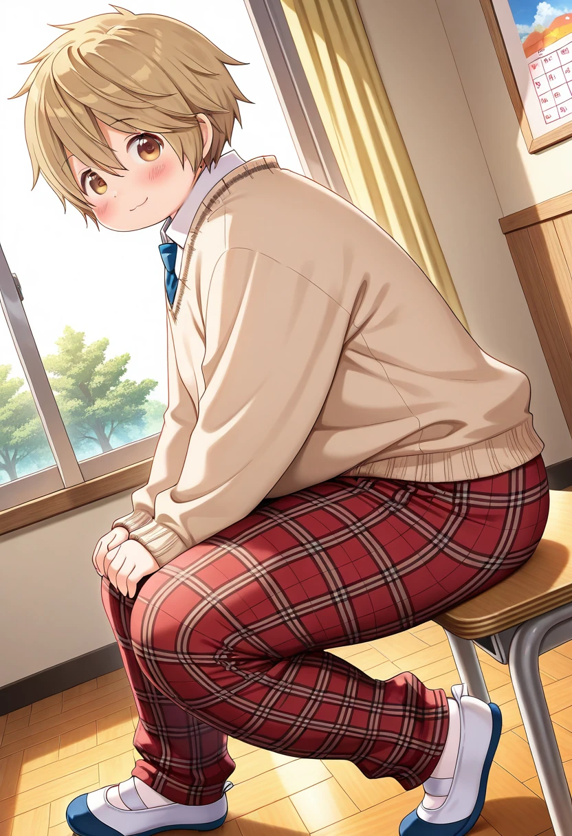 • school uniform, sweater, necktie, shirt, brown/red plaid pants, uwabaki,