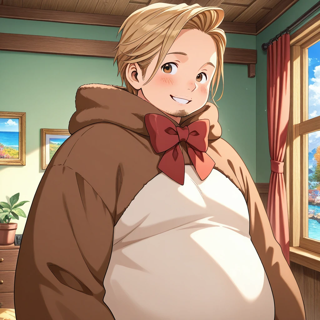 mnt-morino, 1boy, brown-blonde hair, brown-blonde eyes, chubby, agep up