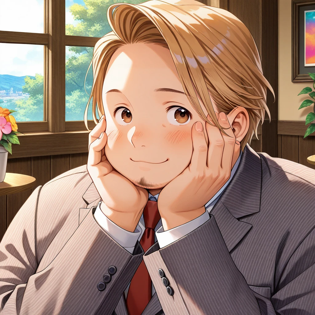 mnt-morinoup, 1boy, brown-blonde hair, brown-blonde eyes, chubby, goatee stubble