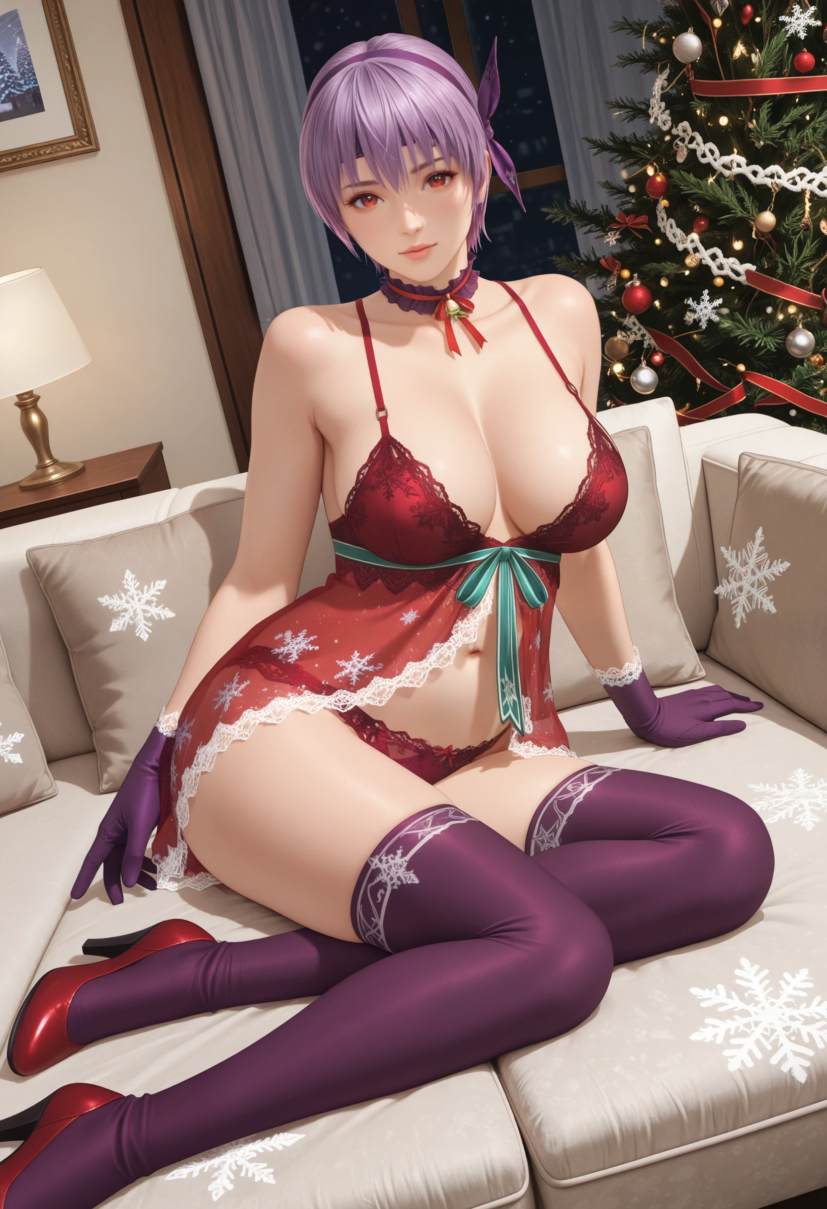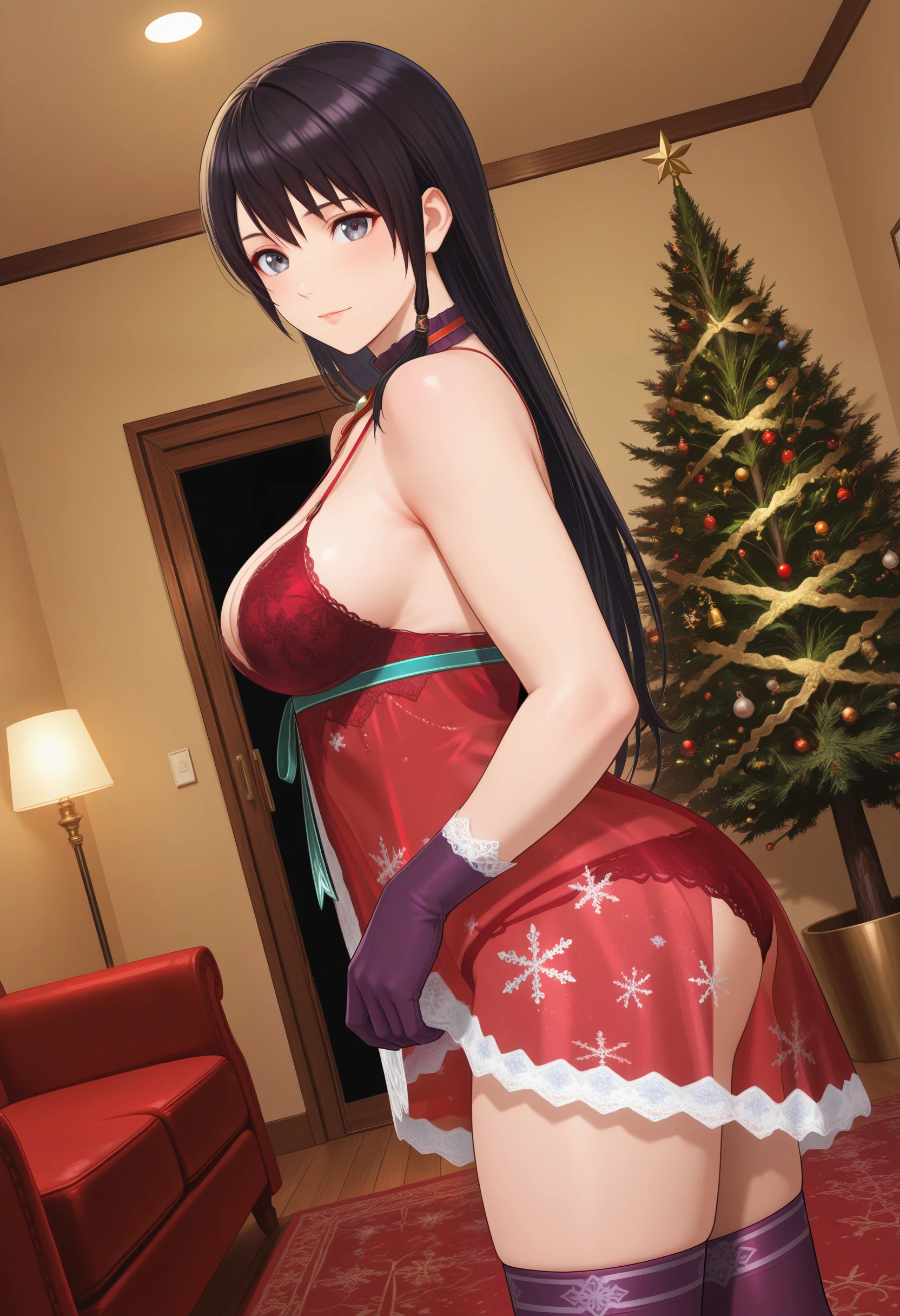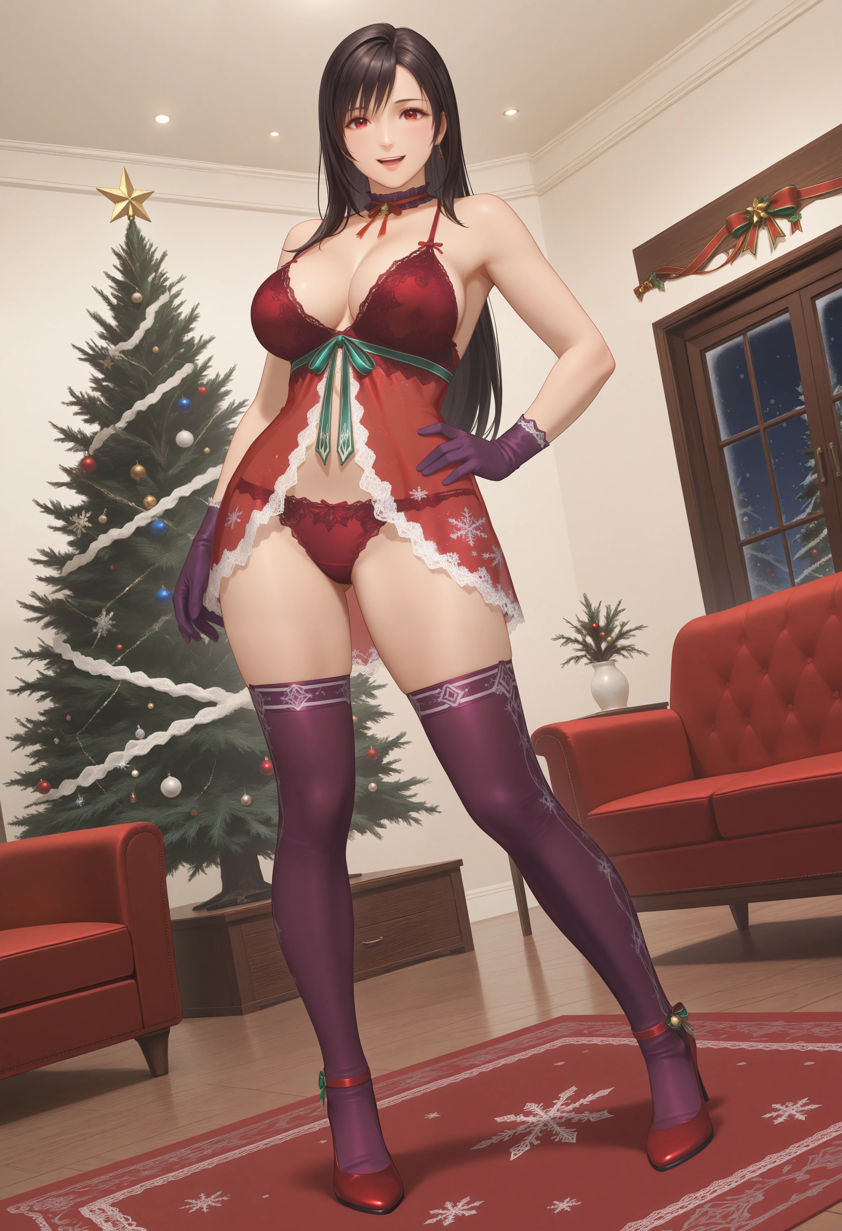 基本プロンプト:"NoelCharmant,red babydoll,see-through clothes,laced bra cup,snowflake print skirt,purple gloves,lace-trimmed panties,lingerie,purple thighhighs,red high heels"