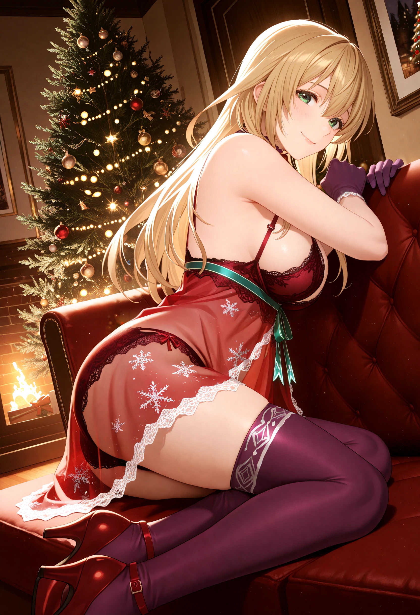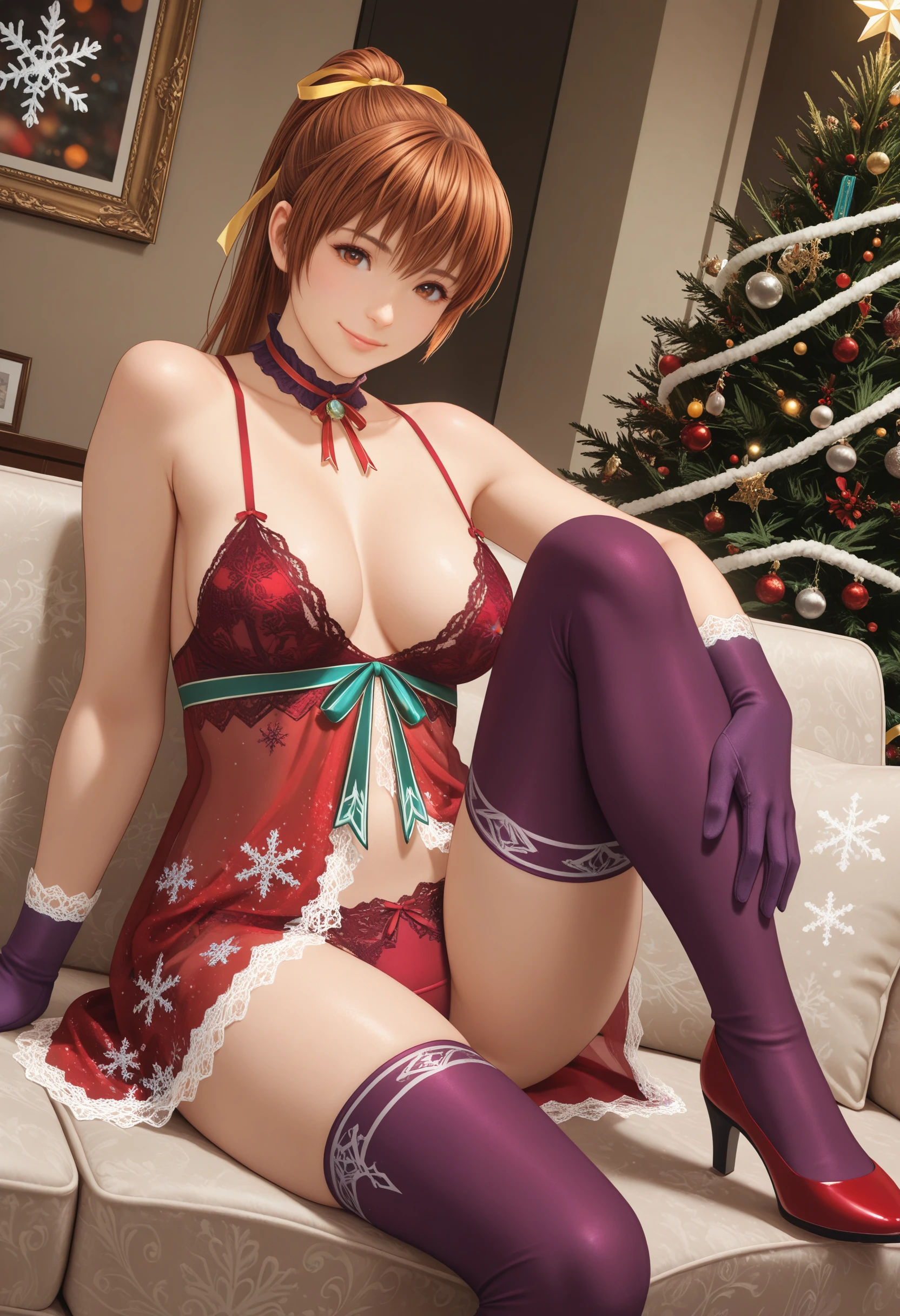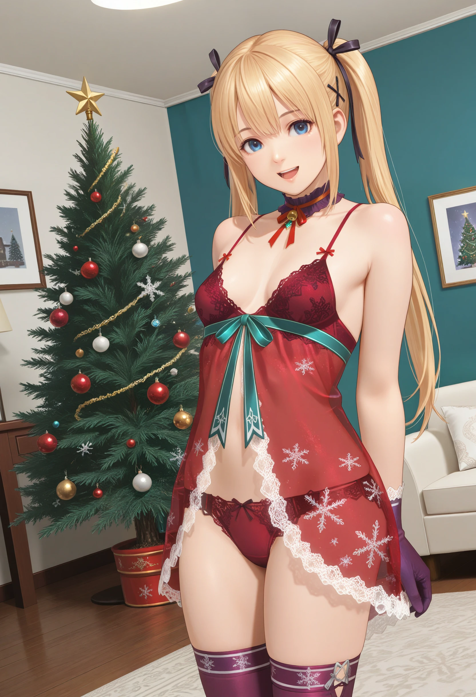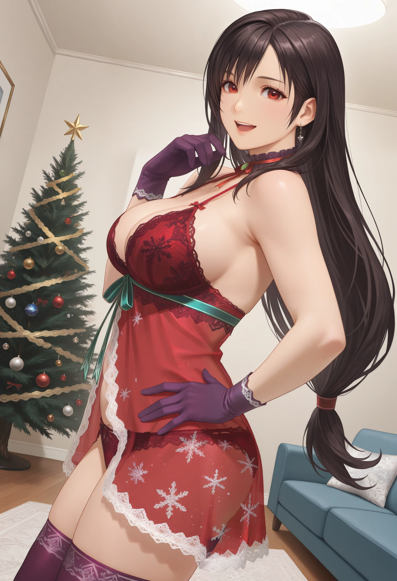 基本プロンプト:"NoelCharmant,red babydoll,see-through clothes,laced bra cup,snowflake print skirt,purple gloves,lace-trimmed panties,lingerie,purple thighhighs,red high heels"