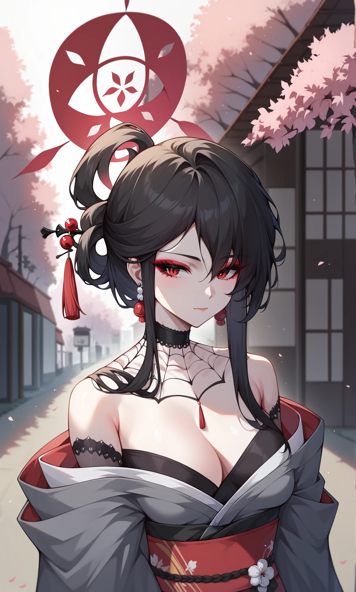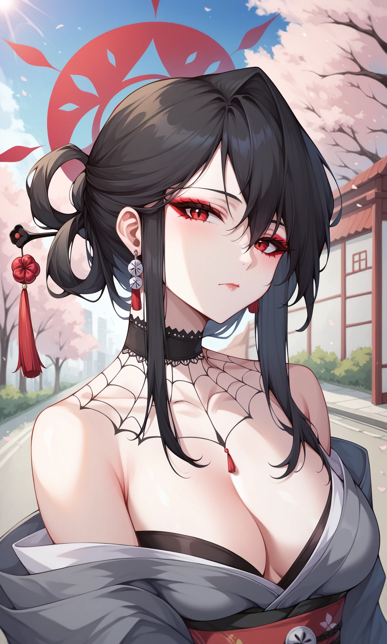 outfit: gray kimono, japanese clothes, wide sleeves, obi, off shoulder, choker, spider web pattern, goth fashion, eyeliner, tassel