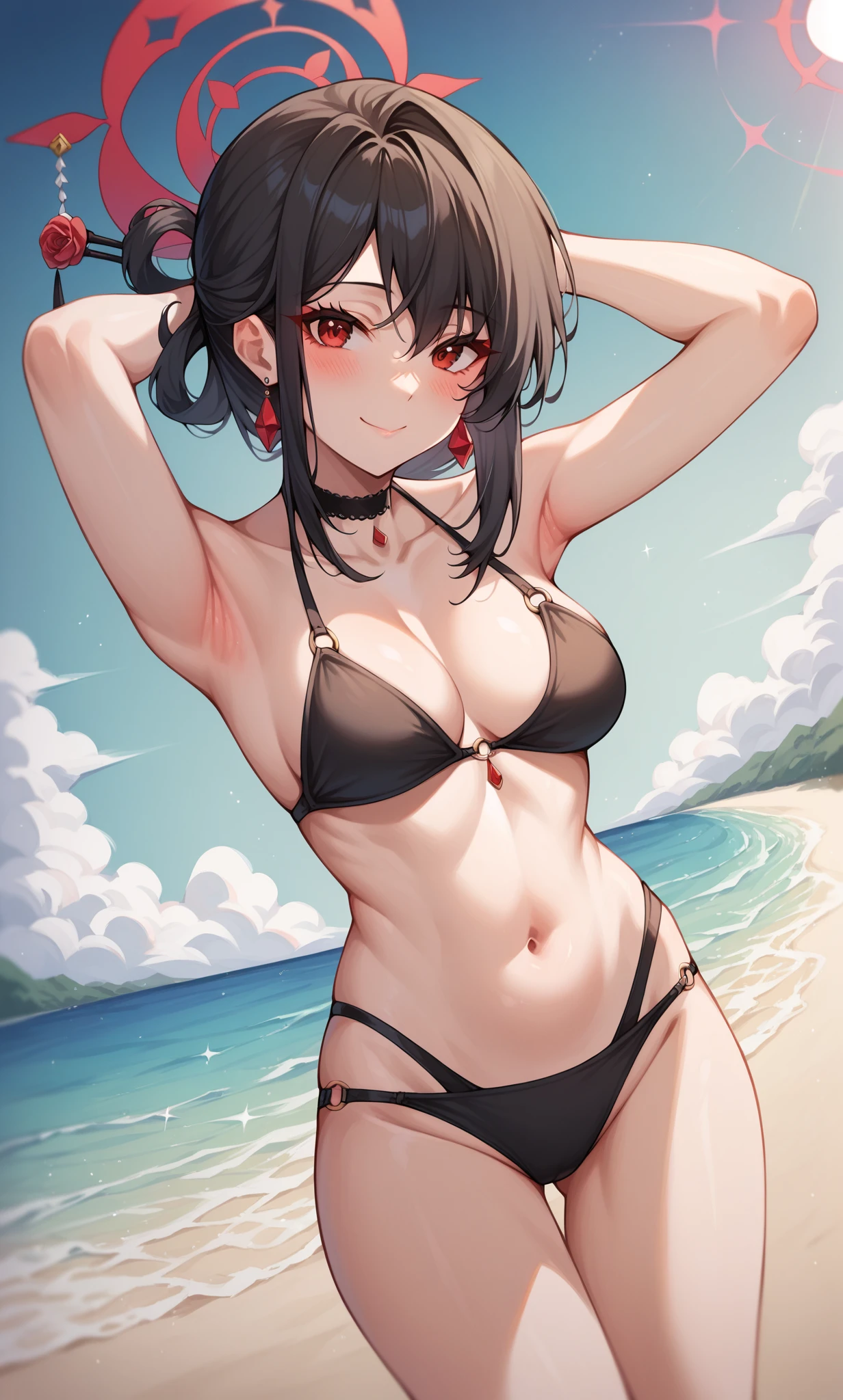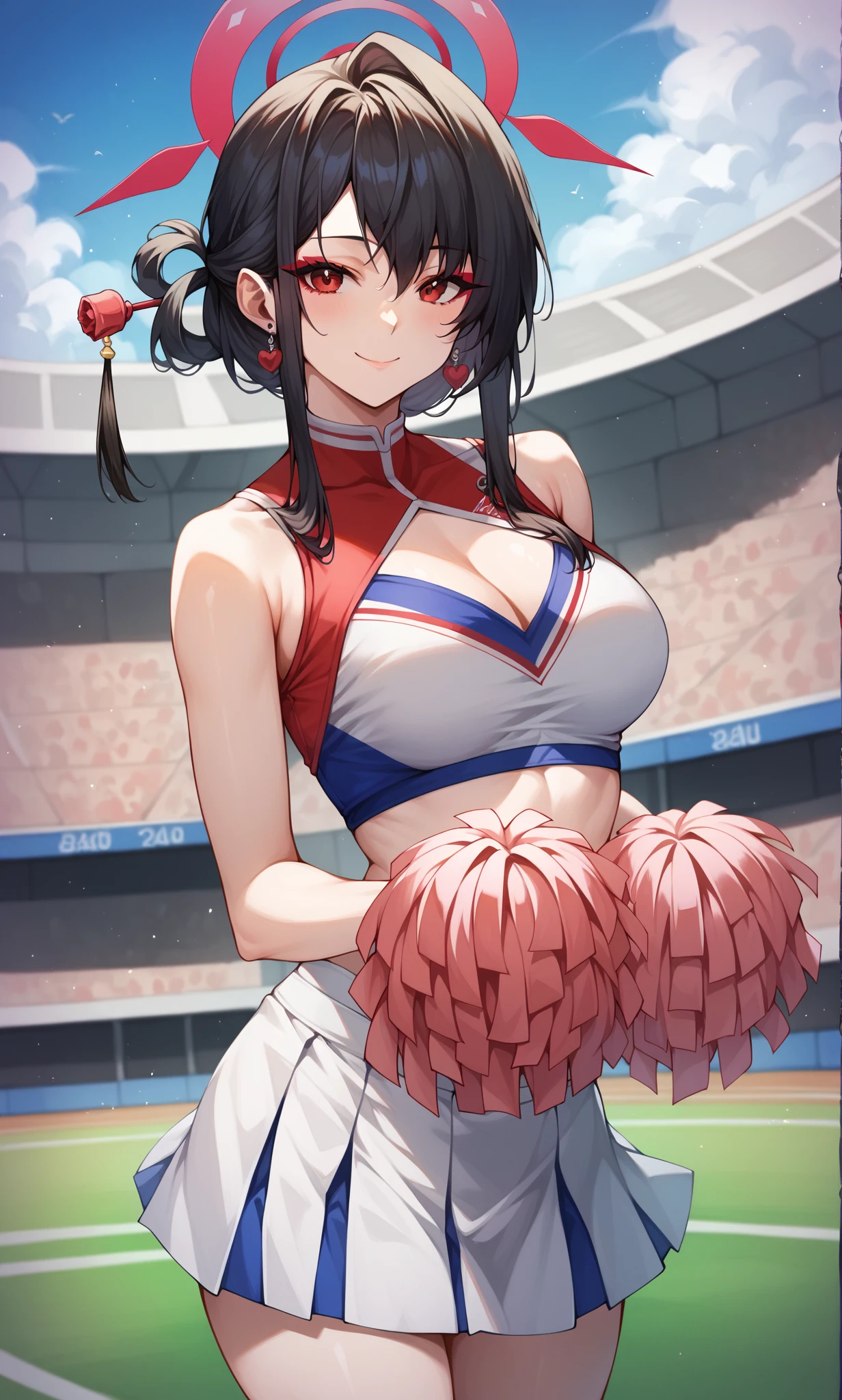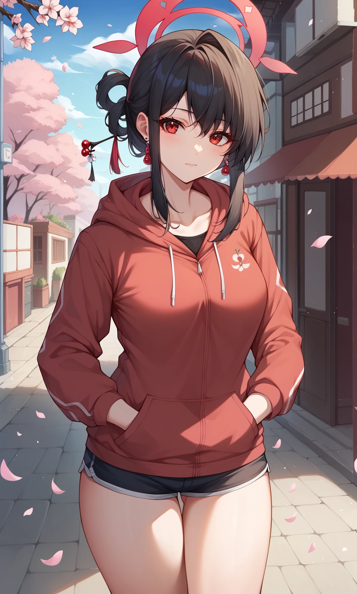kokuriko, red eyes, black hair, hair bun, sidelocks, hair ornament, hair stick, earrings, halo