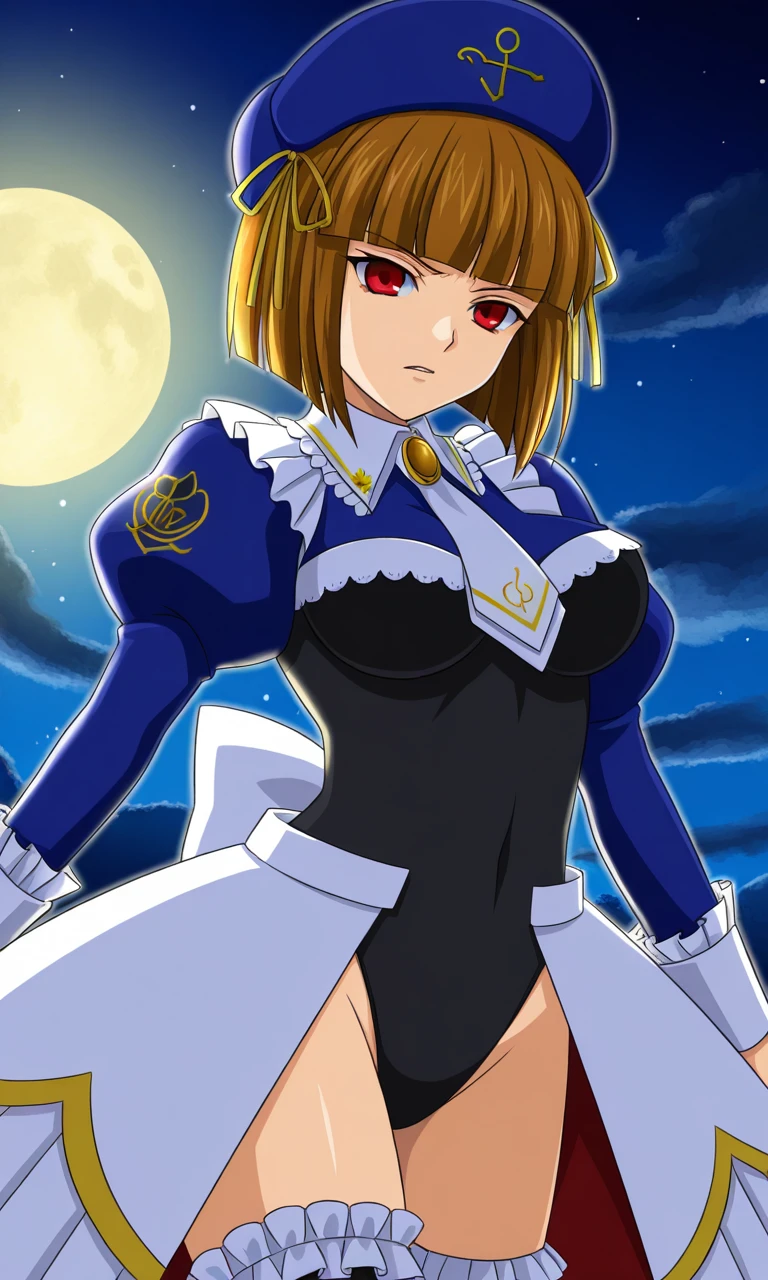 cornelia(umineko),short hair,brown hair,hair ribbon,red eyes,medium breasts,blue dress,hat,white tie,gold trim,black leotard,white showgirl skirt,white garter belt,frilled thighhighs