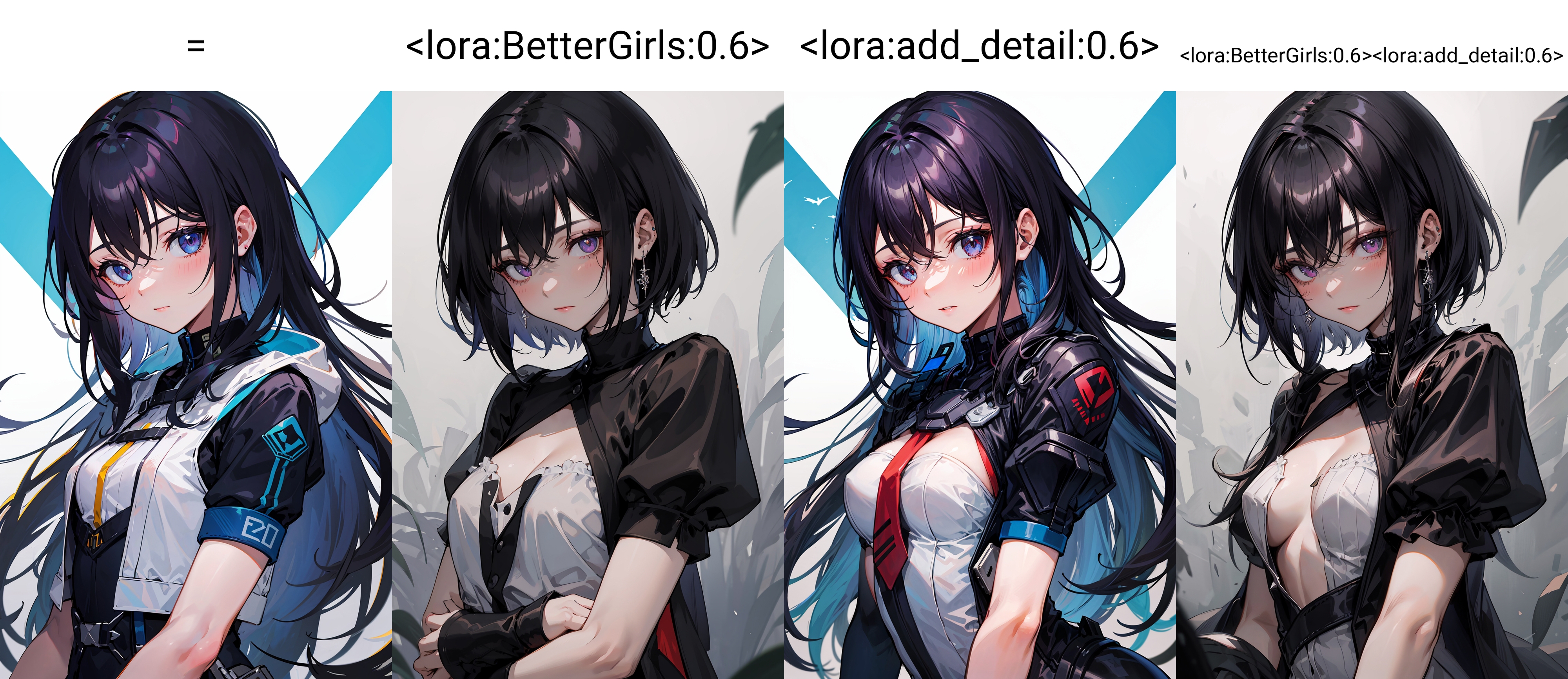 loRA makes your art more detailed by detailing hair and faces, as well as adding detail to things like earrings and necklaces.Also, loRA has a pretty big effect on background, lights and exposure
