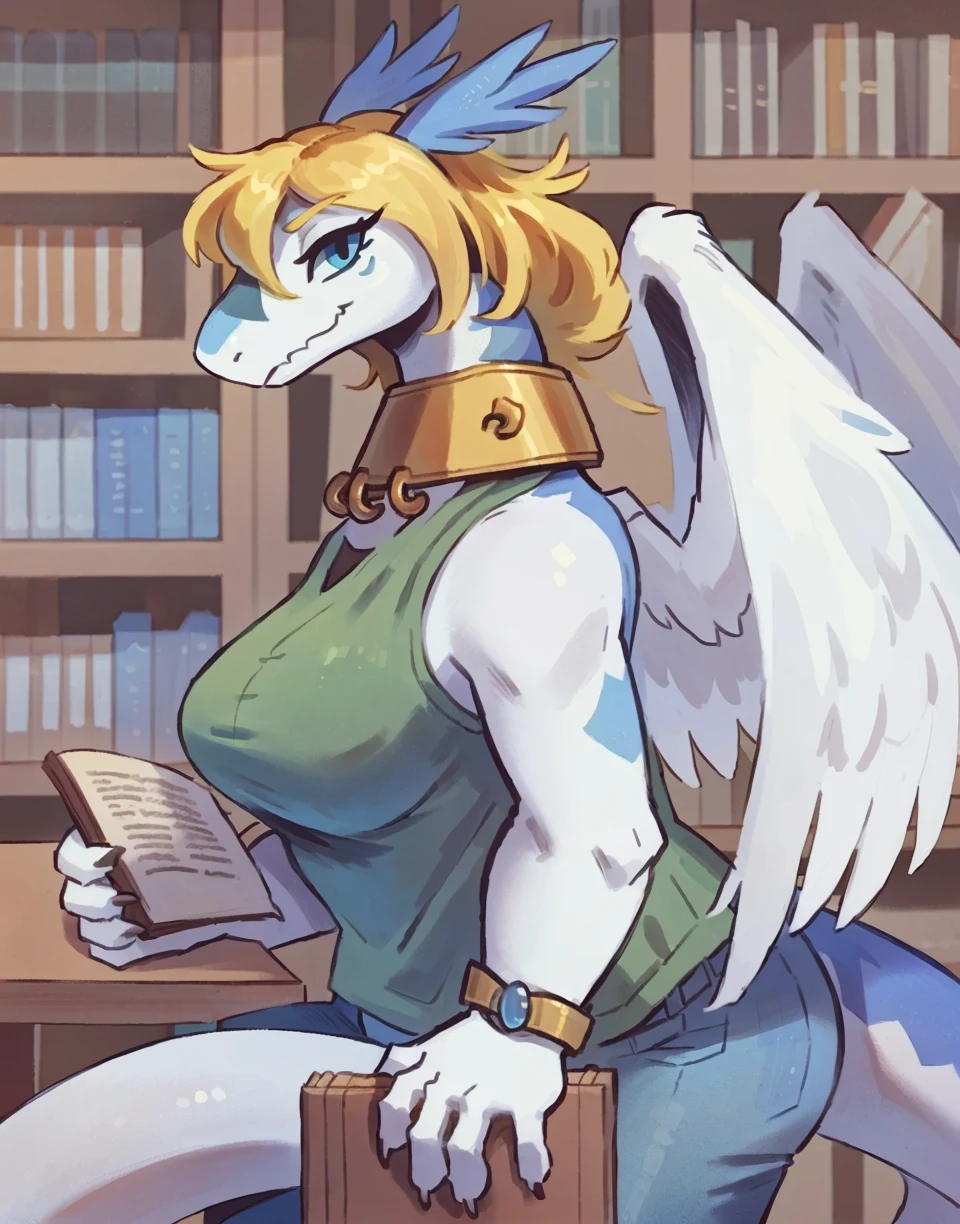 shiron, dragon, white body, blue body, yellow/blonde hair, fluffy hair, feathered wings, wing piercings, tail, blue eyes, slit pupils, neck brace, aviator cap, goggles on head, gloves, 3 fingers
