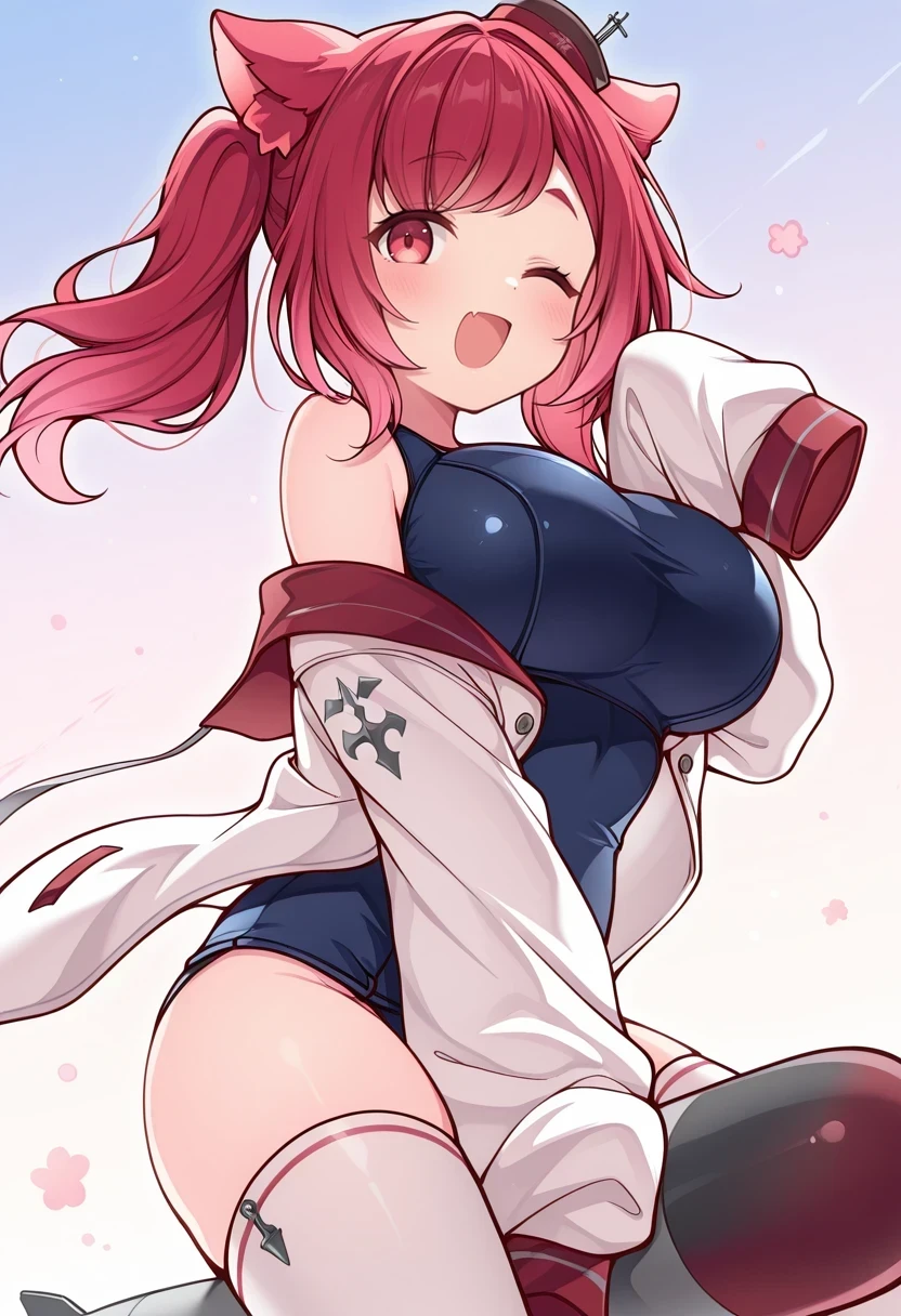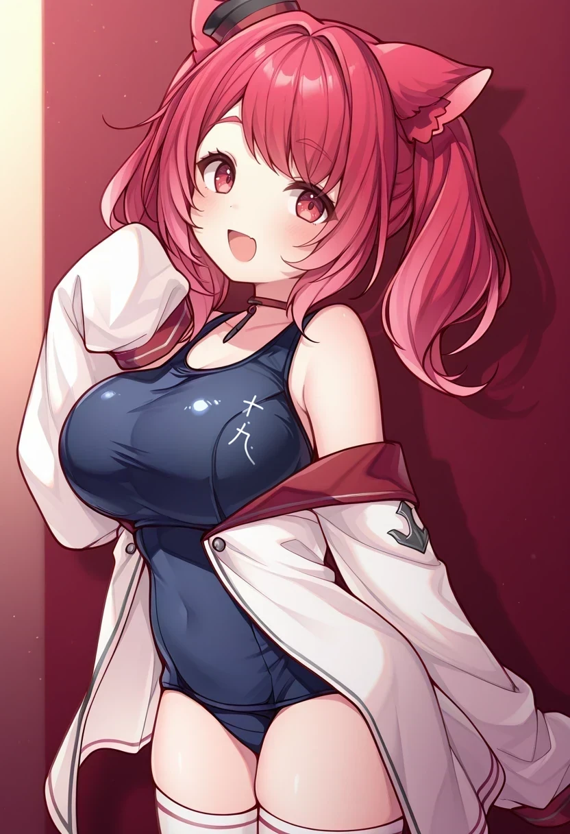 white thighhighs,white jacket,off shoulder,sleeves past fingers,school swimsuit,mini hat,