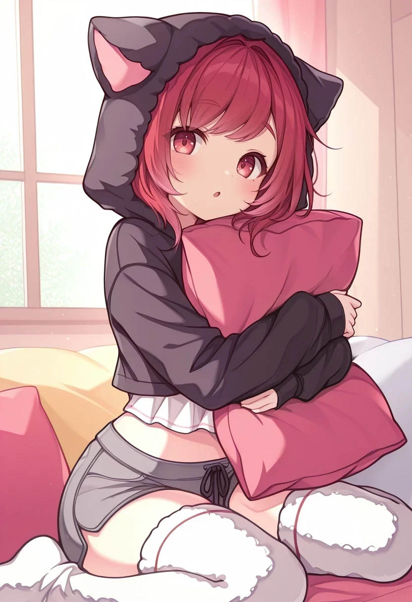 animal hood,black hoodie,wool thighhighs,grey shorts,white camisole,midriff,white legwear,