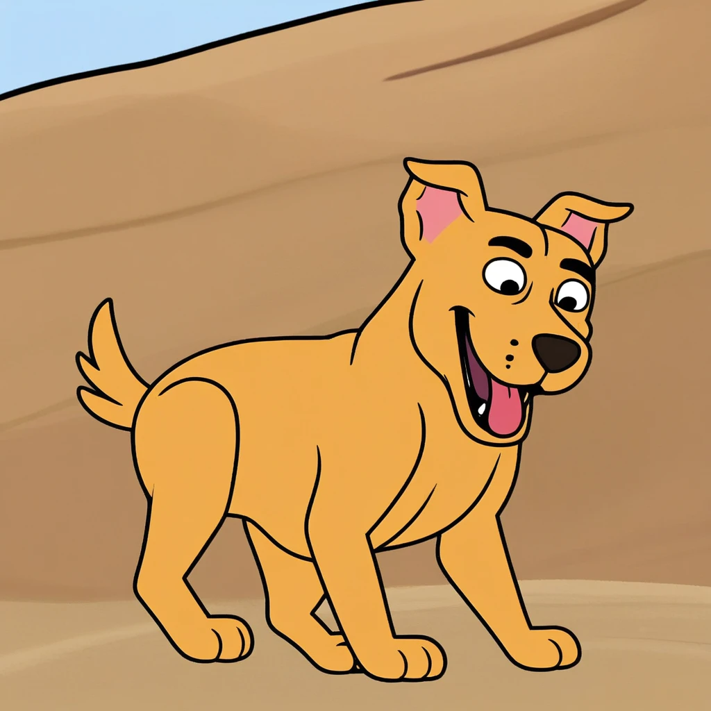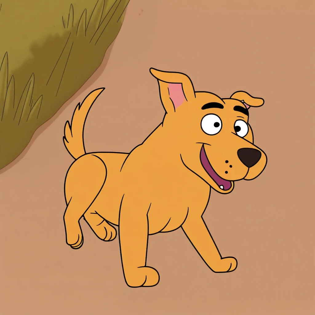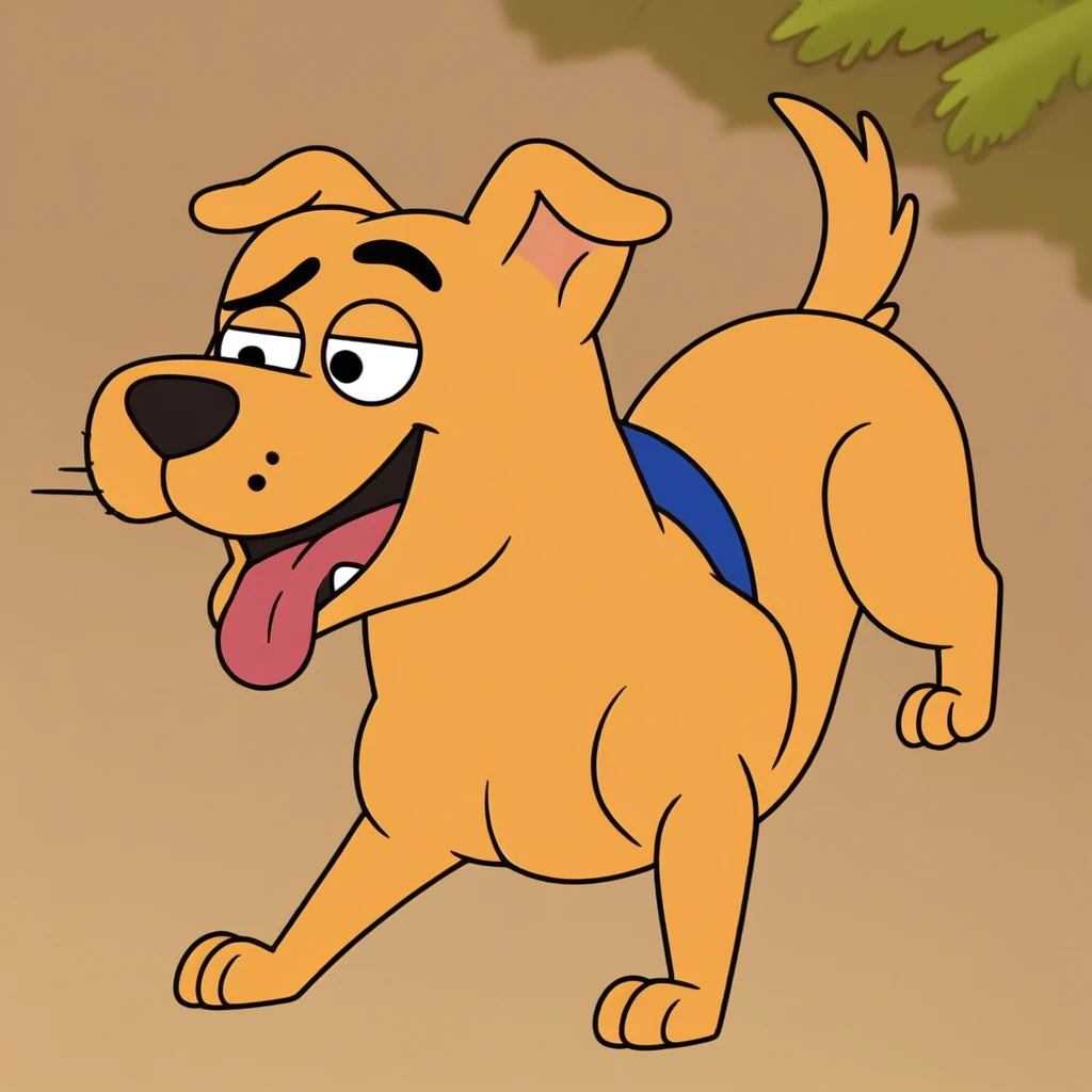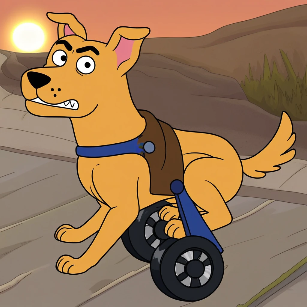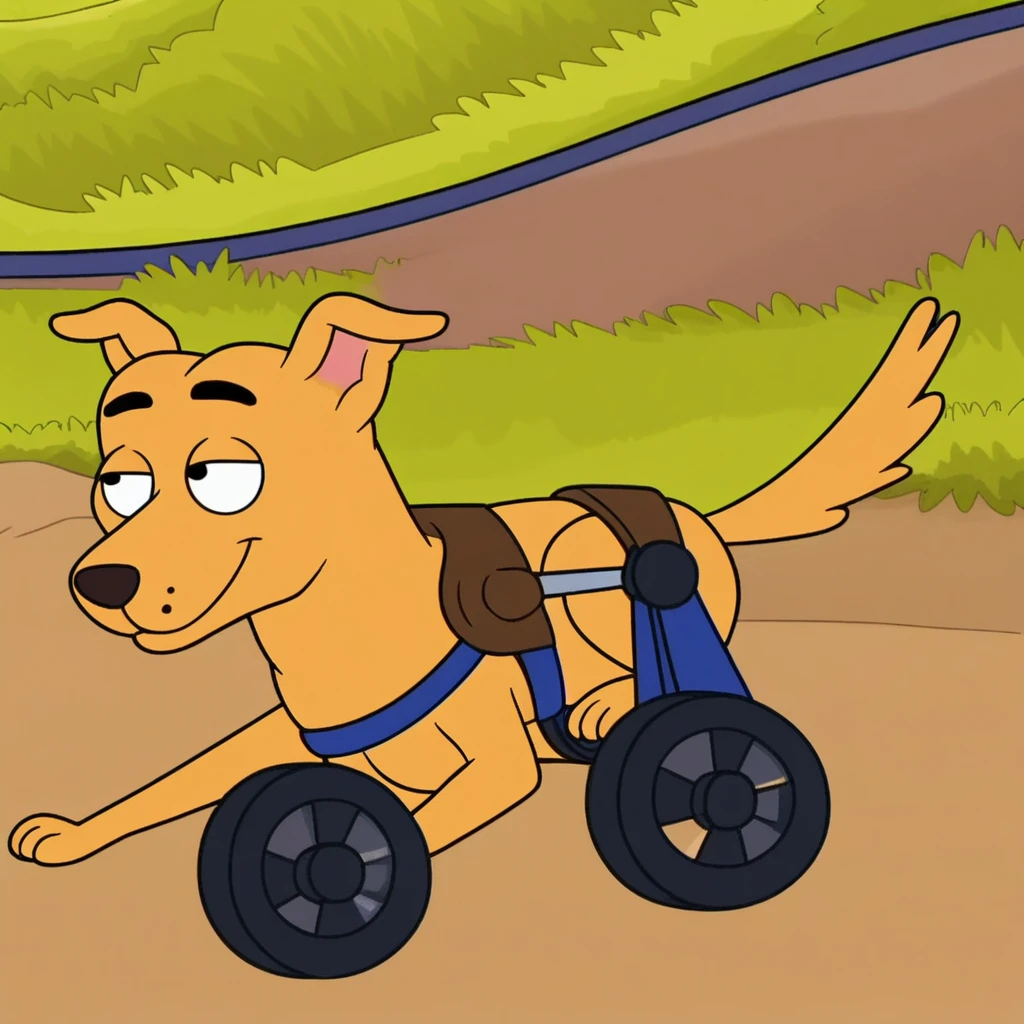 Prompt: clark the insufferable mutt, feral, solo, black eyes, mobility gear, two rear wheels, dog, from behind, left front wheel, damaged wheels, spinning wheels, blue collar, bandage