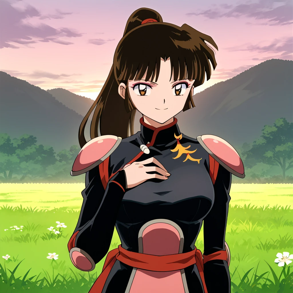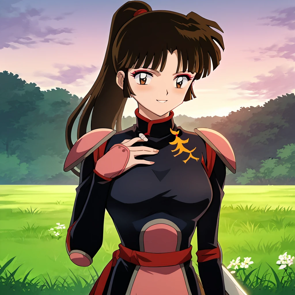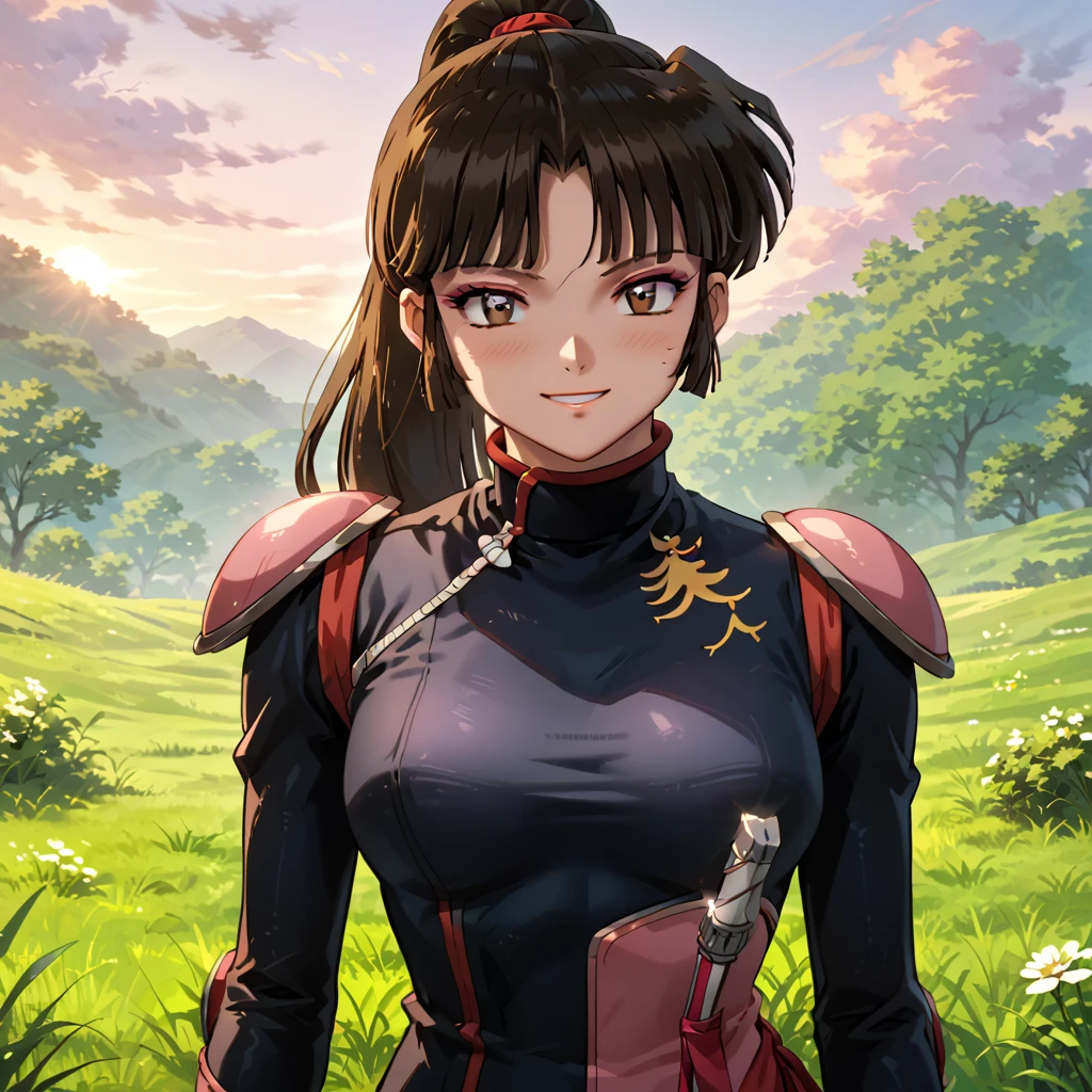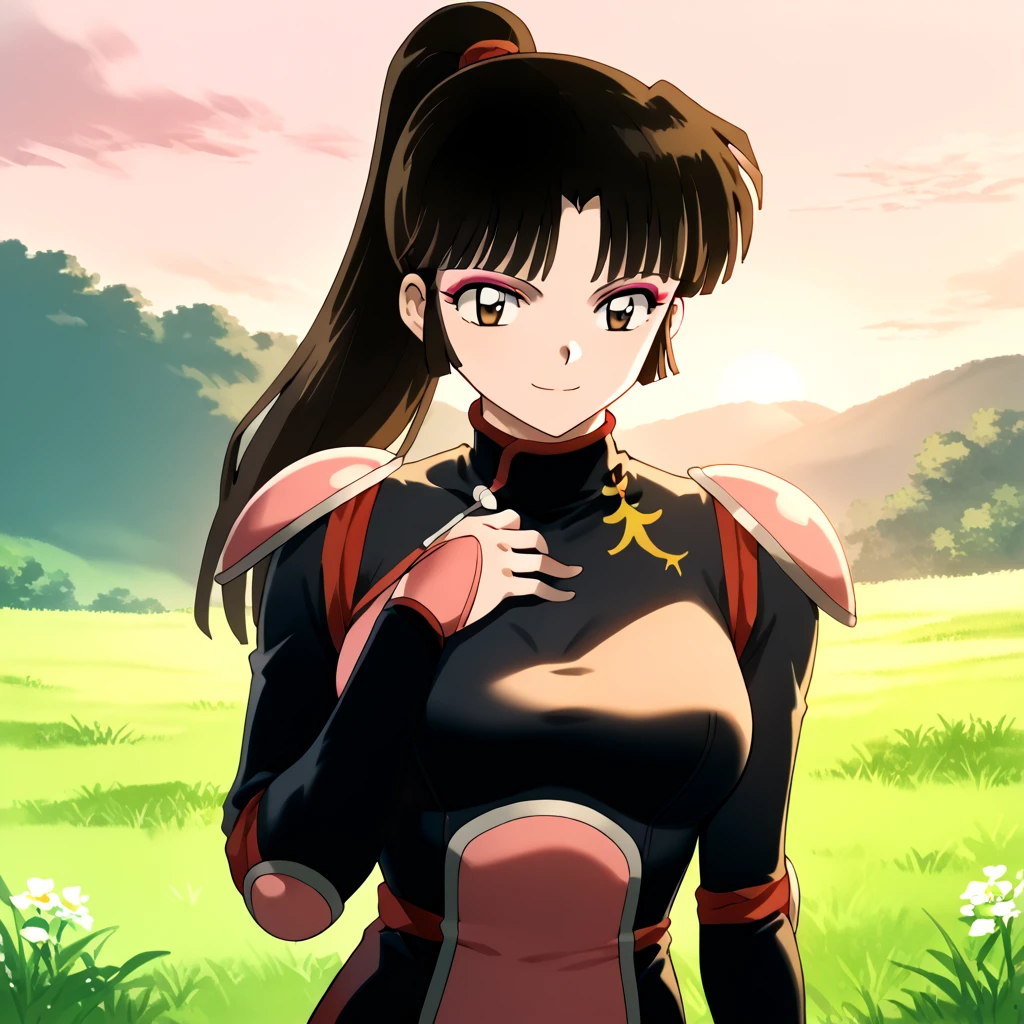 Sango, 1girl, solo, brown eyes, brown hair, black hair, ponytail, makeup, bangs, bodysuit, black bodysuit, shoulder pads, thighs, standing, cowboy shot, anime coloring, retro artstyle, outdoors, day
