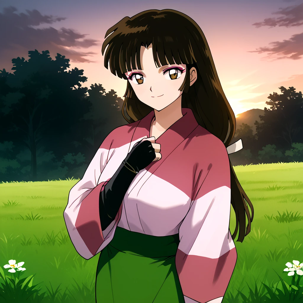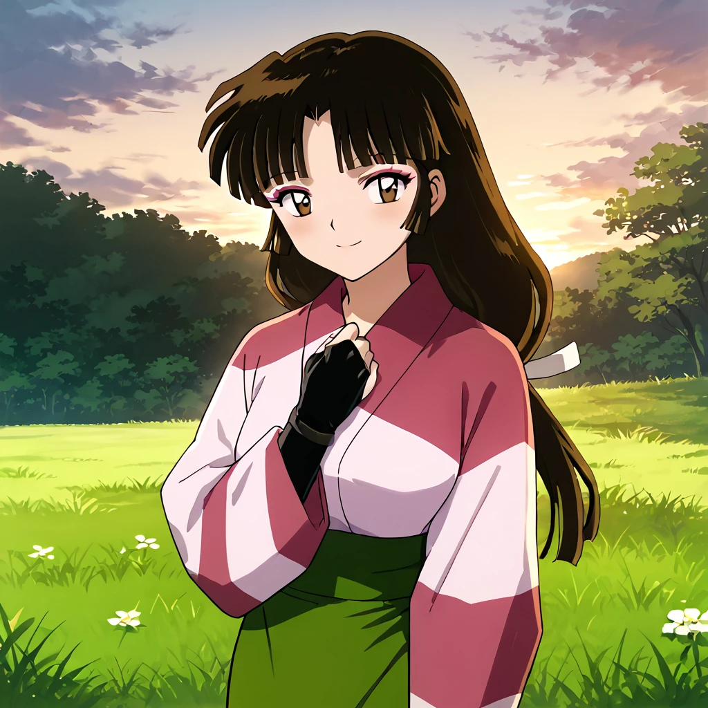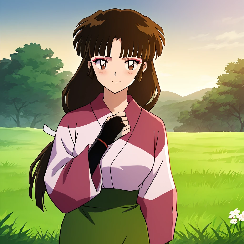 Sango, 1girl, solo, brown eyes, brown hair, black hair, long hair, low-tied long hair, makeup, bangs, kimono, pink kimono, skirt, green skirt, standing, cowboy shot, anime coloring, retro artstyle, outdoors, day