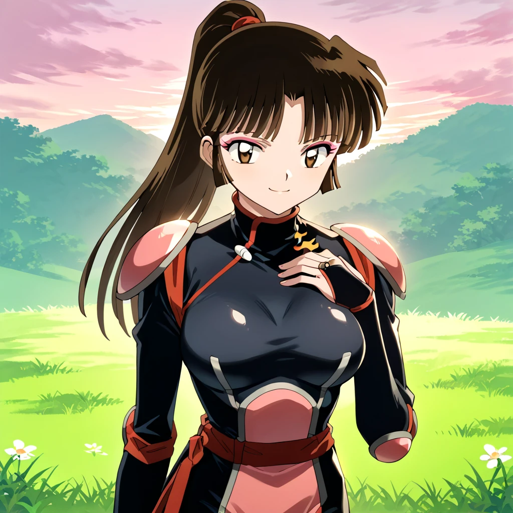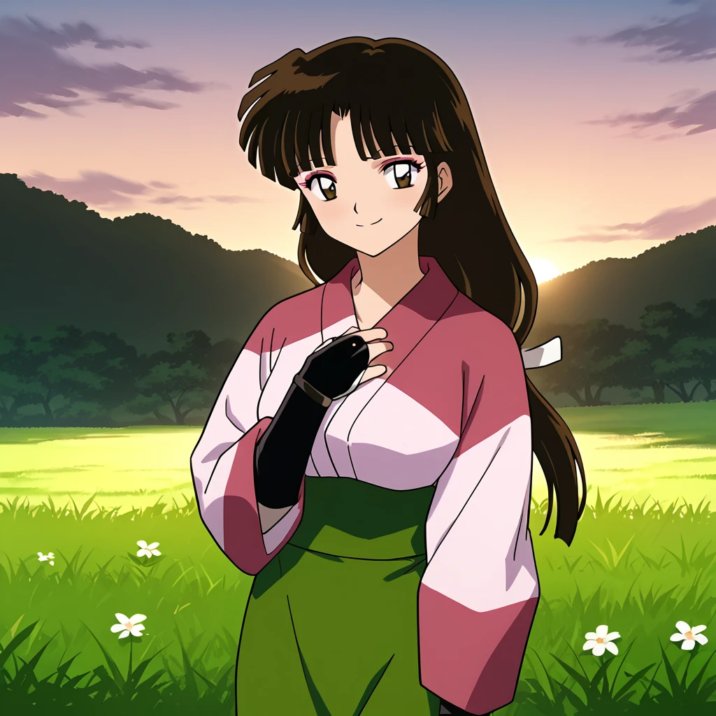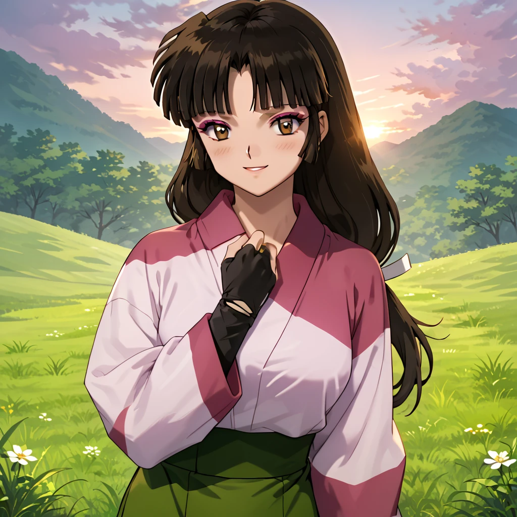 Sango, 1girl, solo, brown eyes, brown hair, black hair, long hair, low-tied long hair, makeup, bangs, kimono, pink kimono, skirt, green skirt, standing, cowboy shot, anime coloring, retro artstyle, outdoors, day