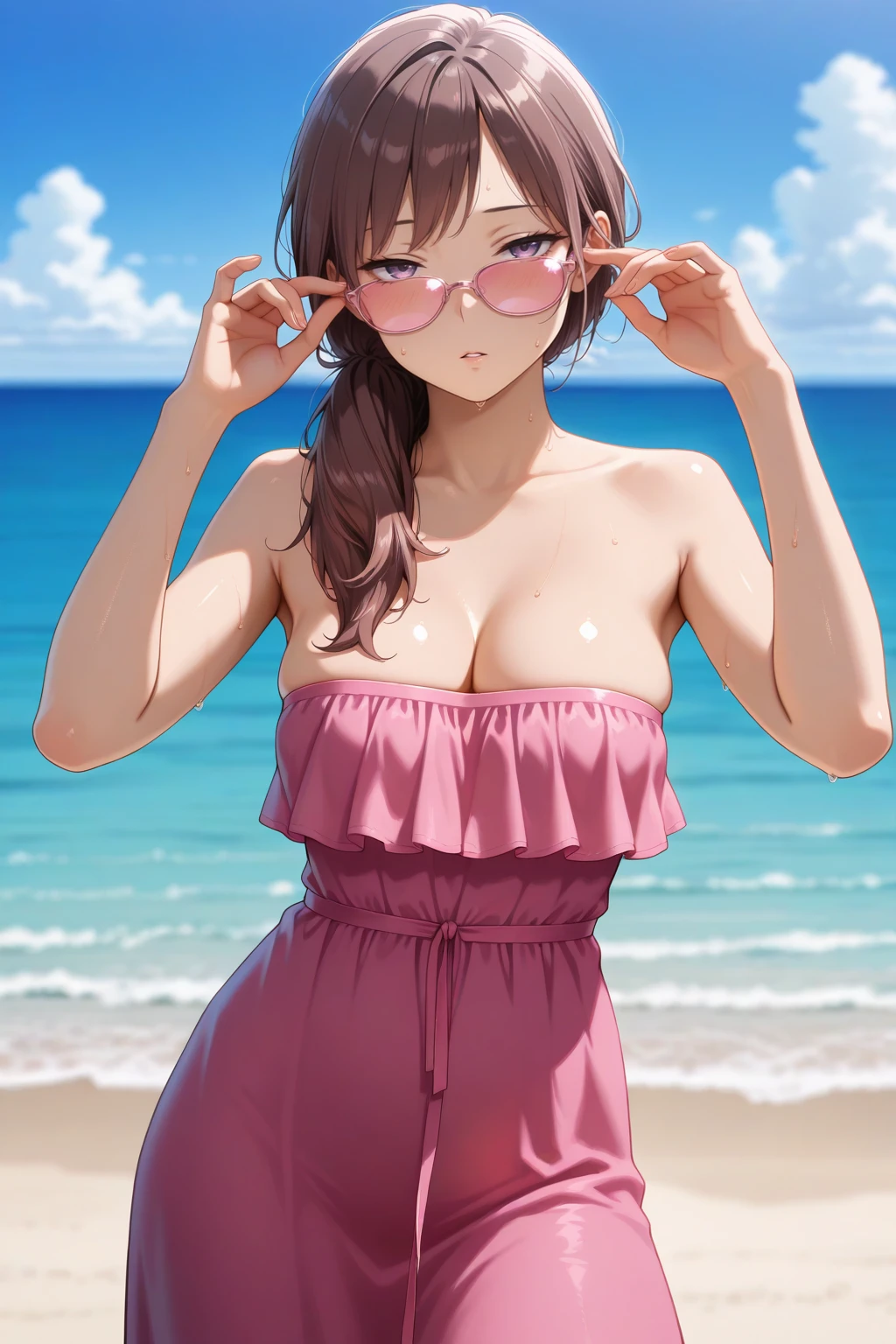 Trigger: kanoko, brown hair, long hair, hair over shoulder, purple eyes,