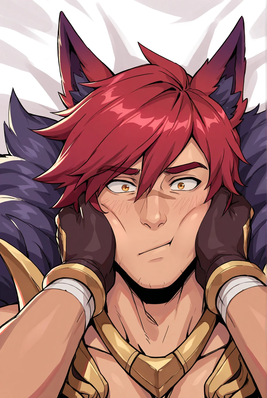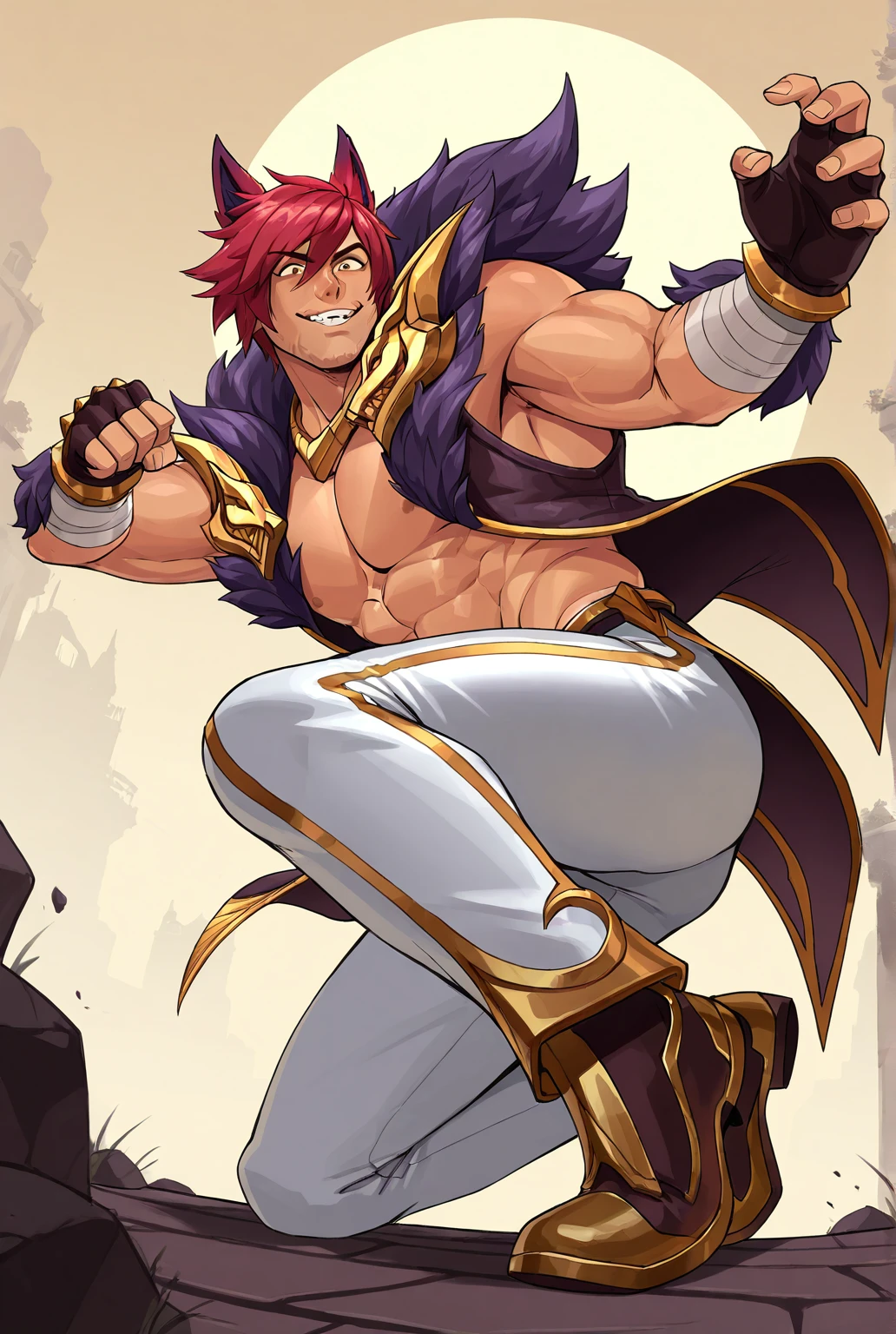 sett 101, sett \(league of legends\), bara,muscular male,mature male,red hair,gloves,animal ears,pants,fingerless gloves,short hair,white pants,jewelry,bandages,fur trim, brass knucklesSuggest 0.7-0.8 strength