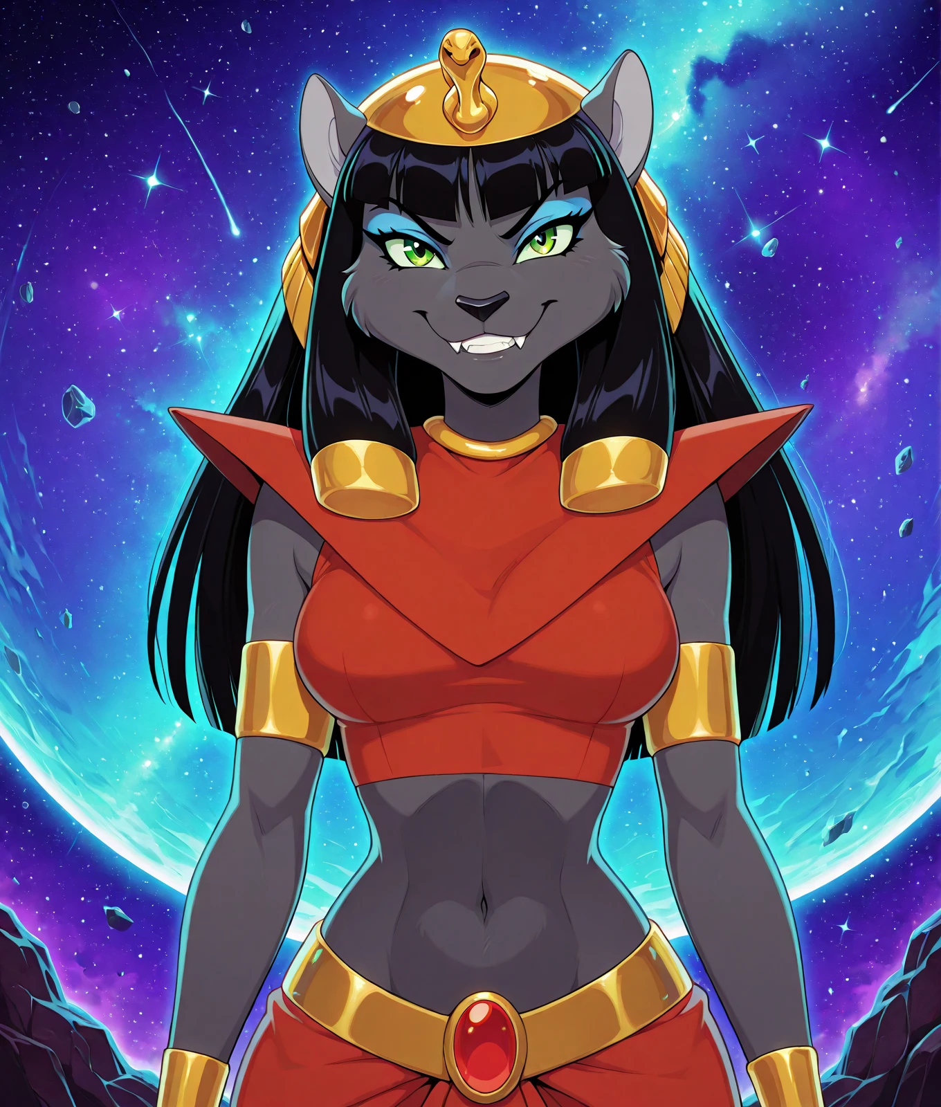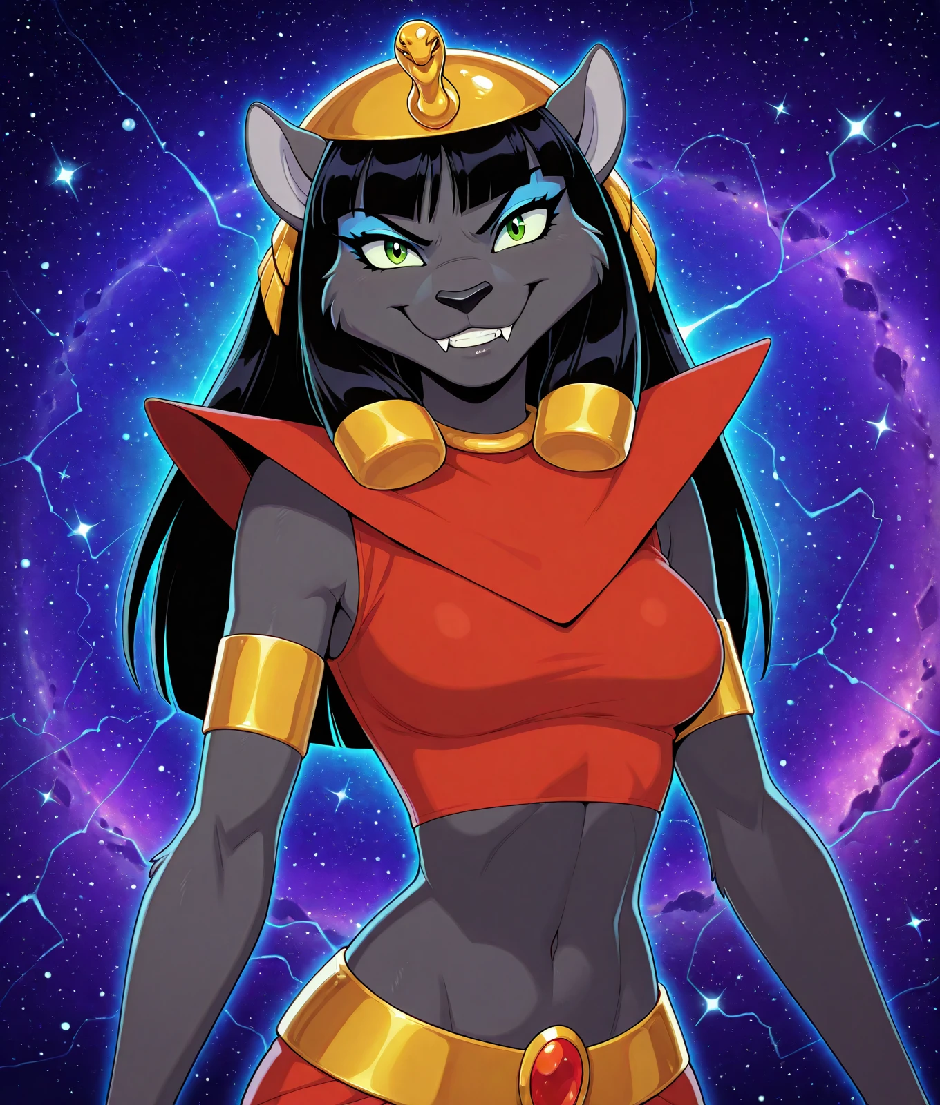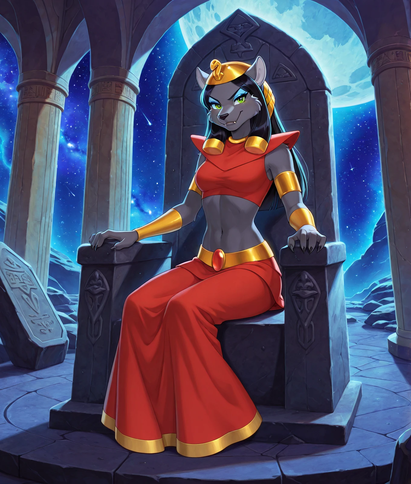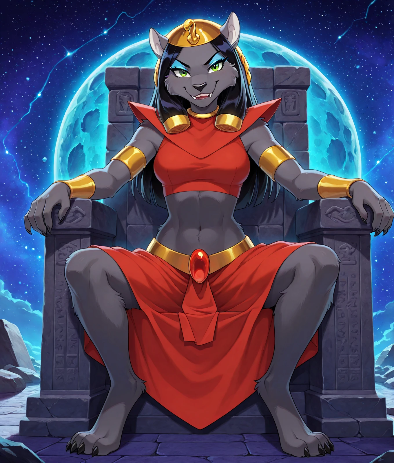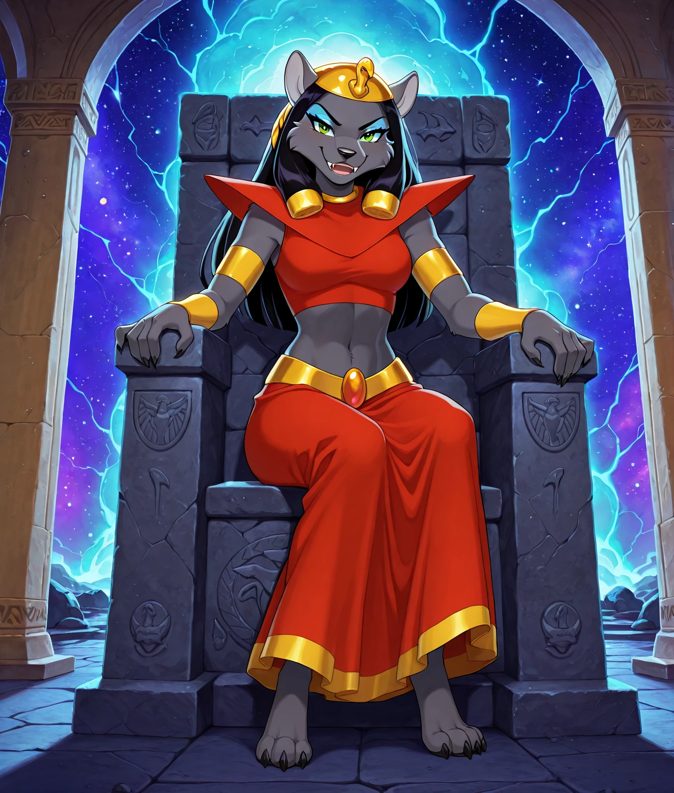 mirage, furry, anthro, golden hair accessoire, golden egyptian hat, flat colors, cartoon, grey fur, golden cuffs, black hair, blue eyeshadow, midriff, golden belt, clawed hands, long black hair, green eyes, red top,red skirt,