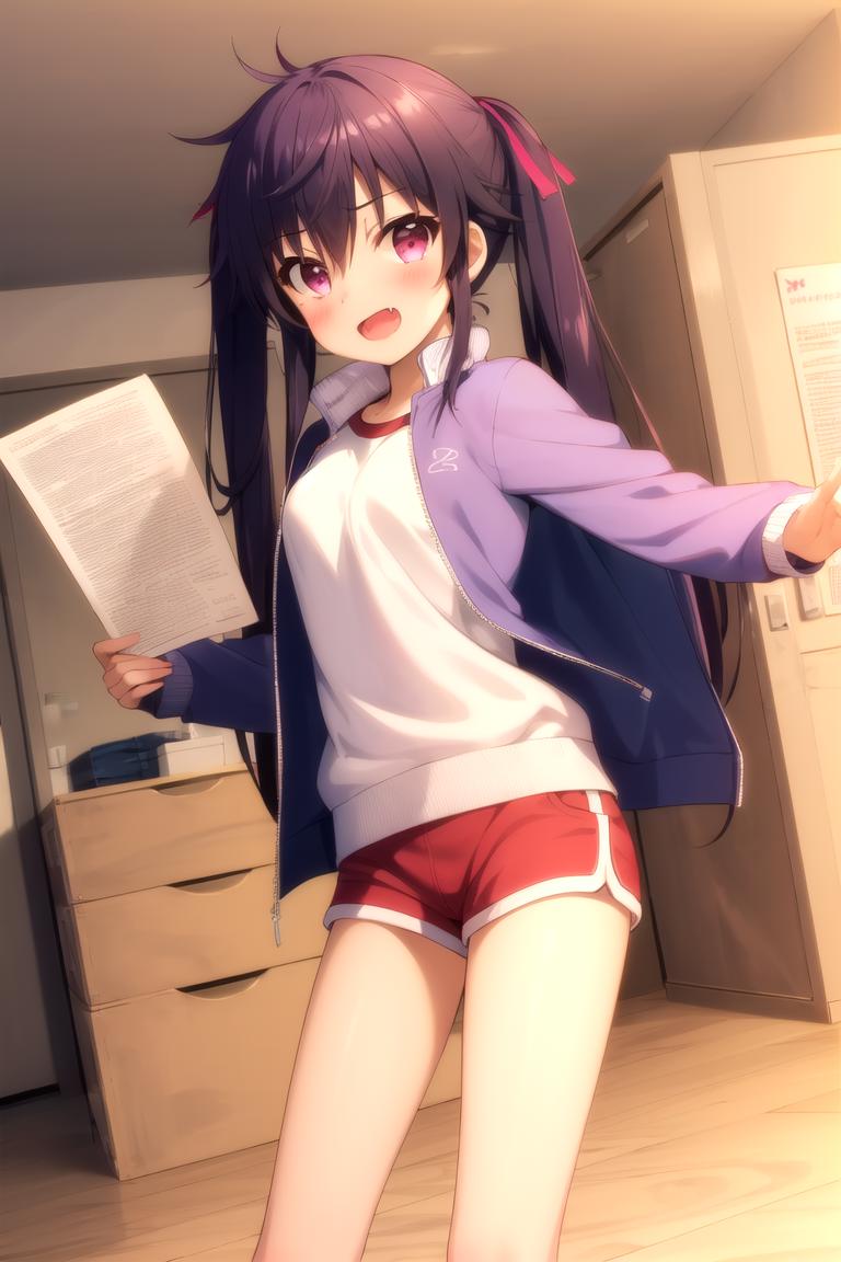 long hair, twintails, purple hair, purple eyes, hair ribbon, gym uniform, shirt, track jacket, red shorts