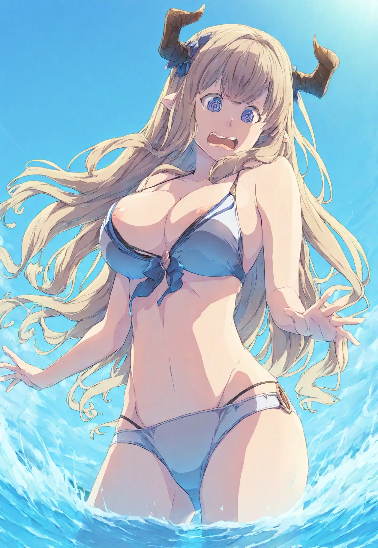 1girl, horns, draph, solo, blonde hair, blue eyes