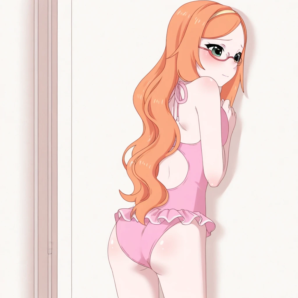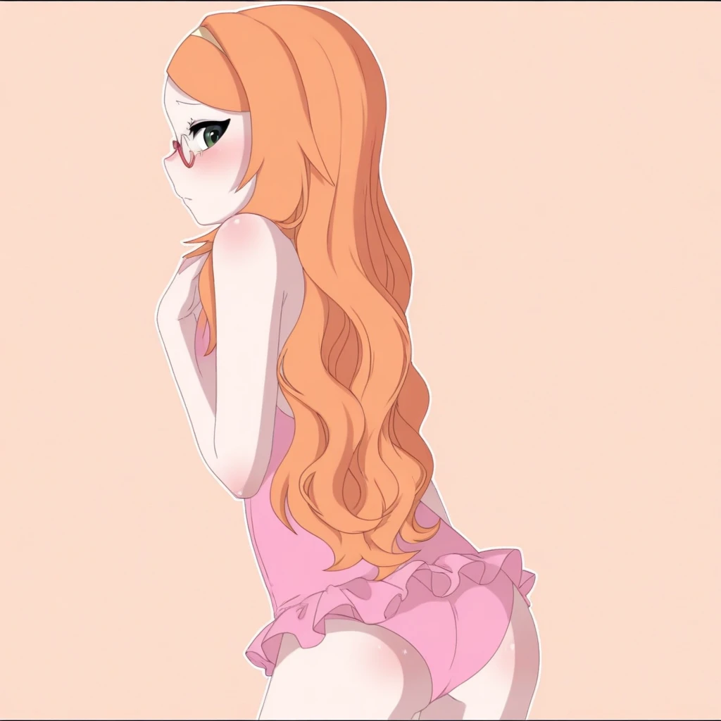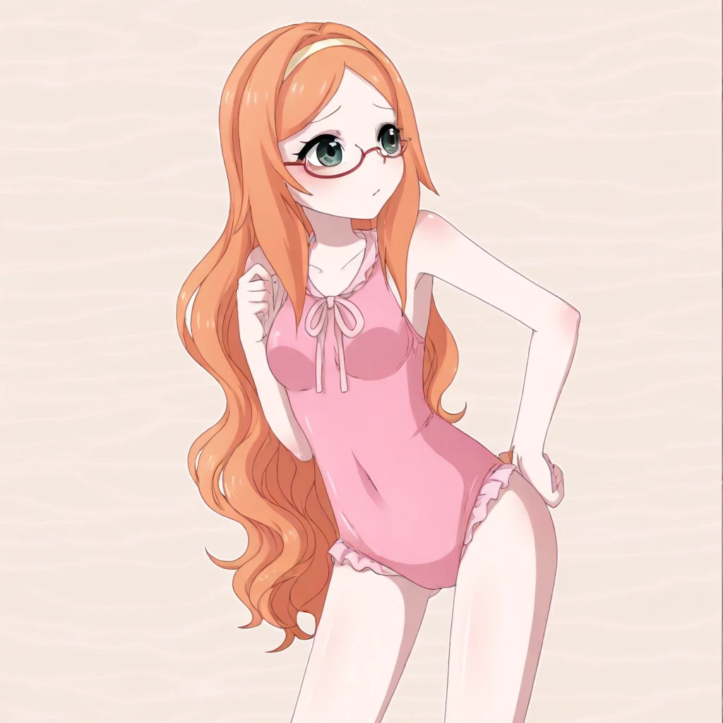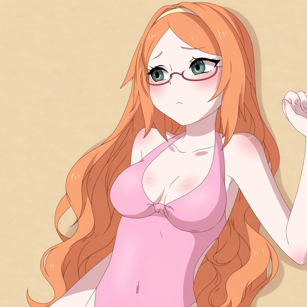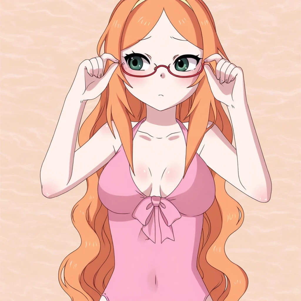 1girl, Ashley_btc, orange hair, long hair, pink rimless glasses, green eyes
