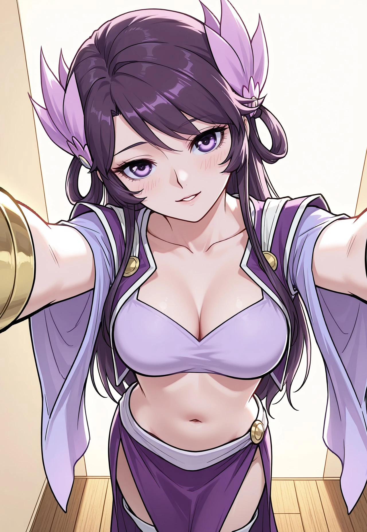1girl, chen_me1er, long straight dark purple hair, waist-length hair, center-parted bangs, sidelocks, looped hair near the ears, hair tied with accessories, pink hair ornaments, petal-shaped hair ornaments, oval face shape, light violet eyes, sharp eye shape, thin eyebrows, narrow waist, medium breasts, long legs,