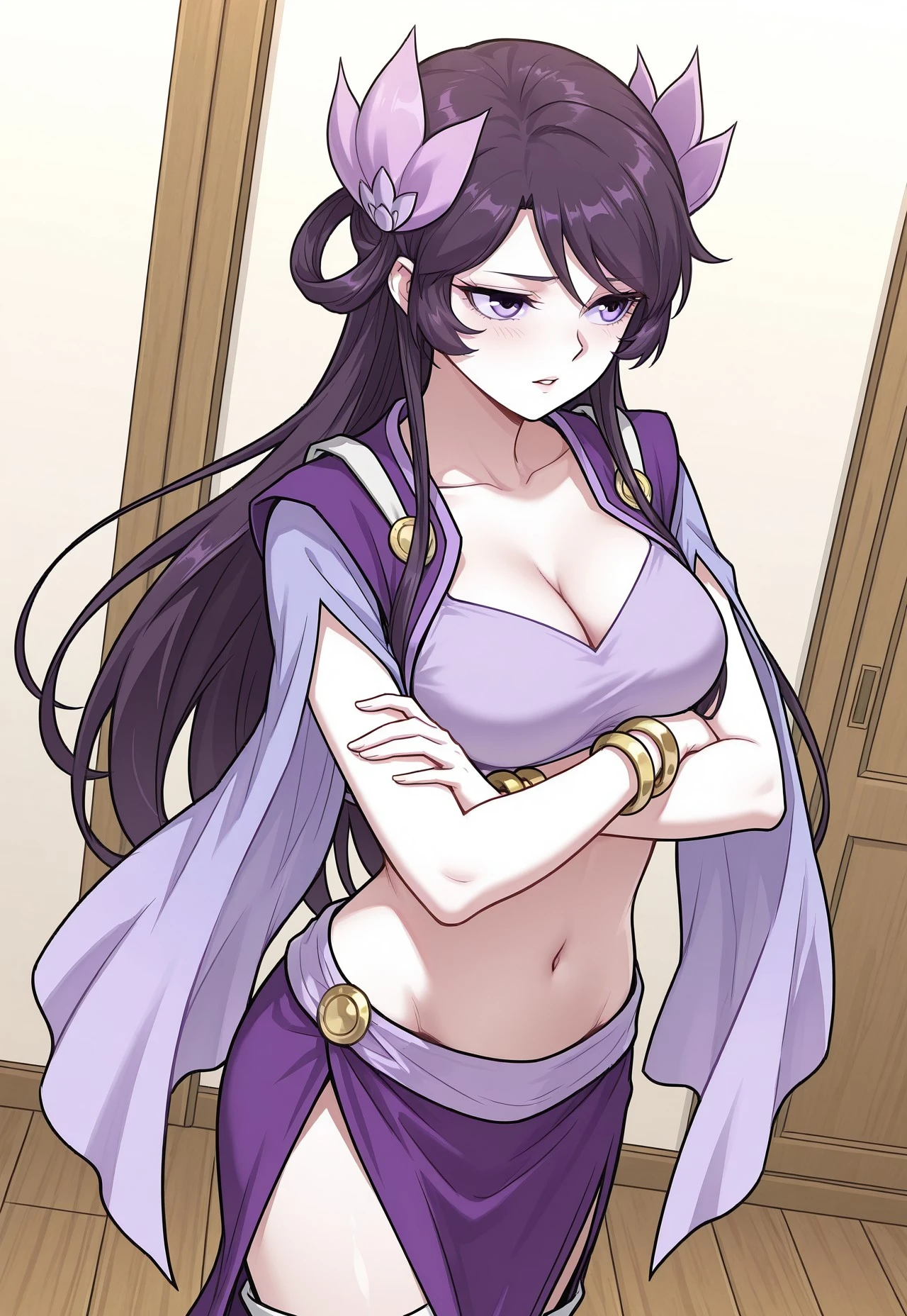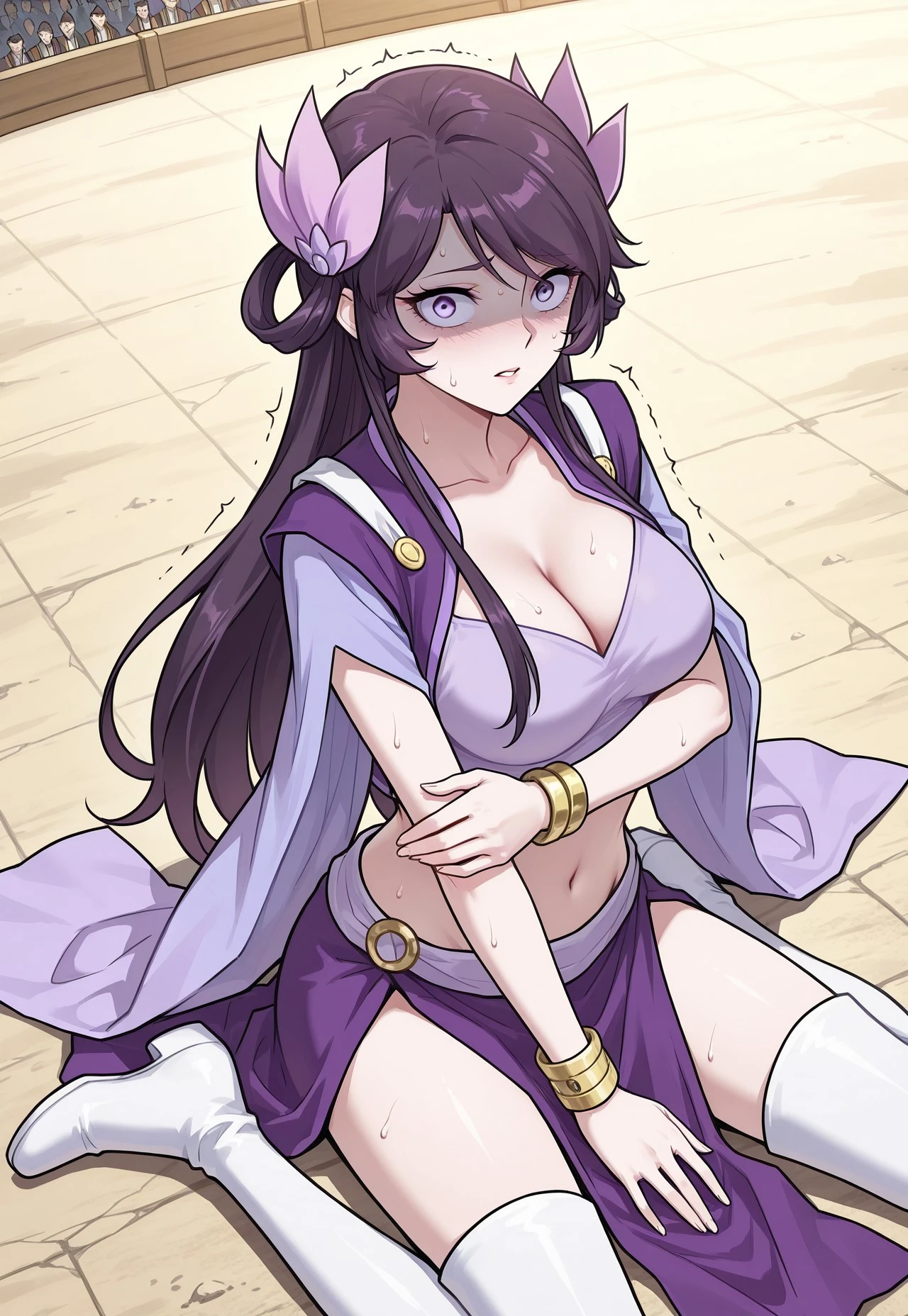 main_outfit, purple cropped top, sleeveless fitted top, exposed midriff, structured neckline, short purple shoulder vest, sleeveless open-front vest, gold button fasteners on vest, underlying sleeves, slit sleeves, exposed arms, wide flowy sleeves, high-slit long purple skirt, loincloth, side skirt panels, white thigh-high boots, low-heeled boots, gold bangles on wrists,