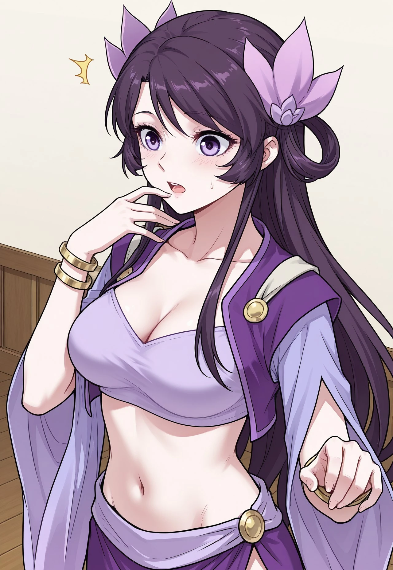 1girl, chen_me1er, long straight dark purple hair, waist-length hair, center-parted bangs, sidelocks, looped hair near the ears, hair tied with accessories, pink hair ornaments, petal-shaped hair ornaments, oval face shape, light violet eyes, sharp eye shape, thin eyebrows, narrow waist, , long legs,