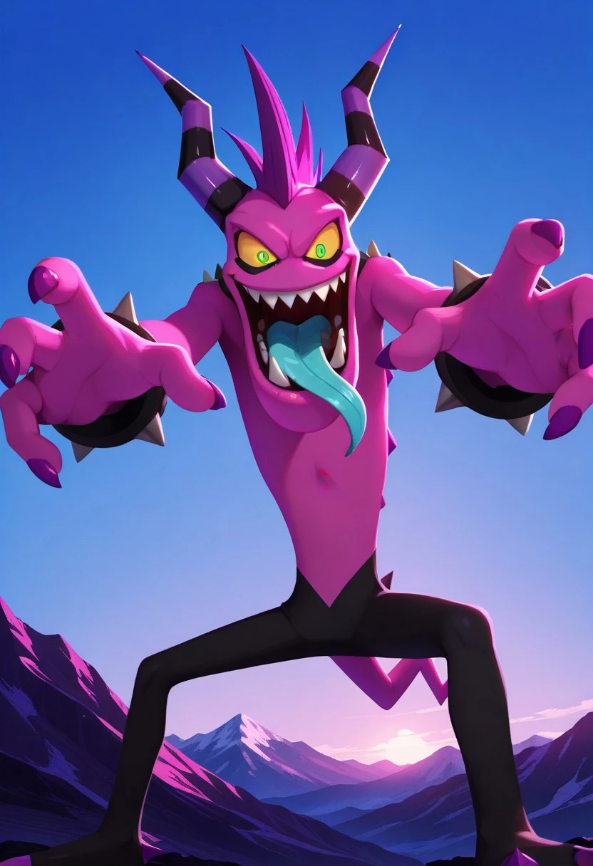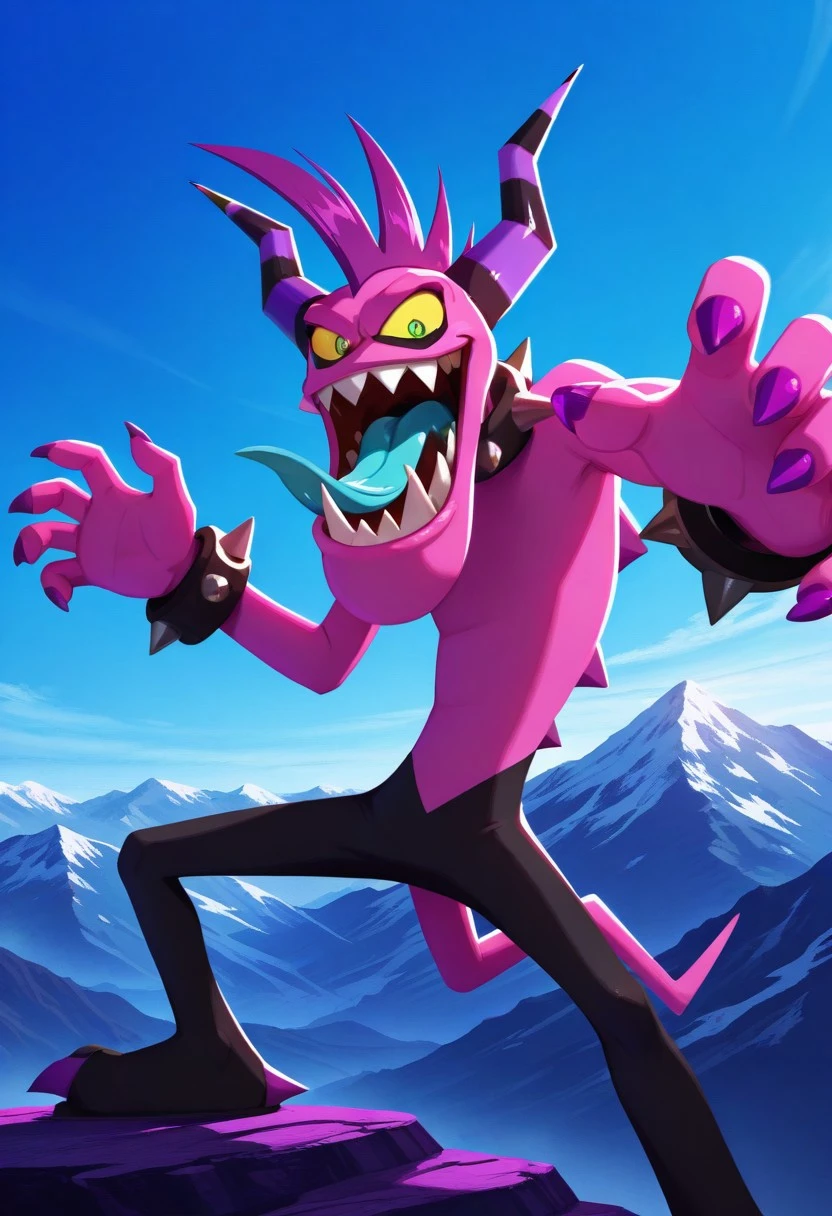 Zazz, pink skin, purple mohawk, yellow sclera, green pupils, black and purple horns, sharp teeth, long blue tongue, purple nails, pink tail, spike collar wristbands, black legs