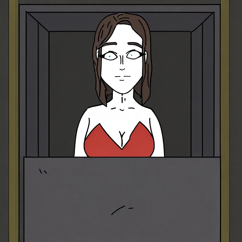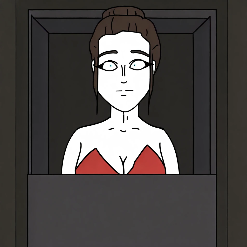 scp446, 1girl, solo, blue eyes, white skin, brown hair, red dress, strapless dress, strapless, breasts, cleavage, emotionless