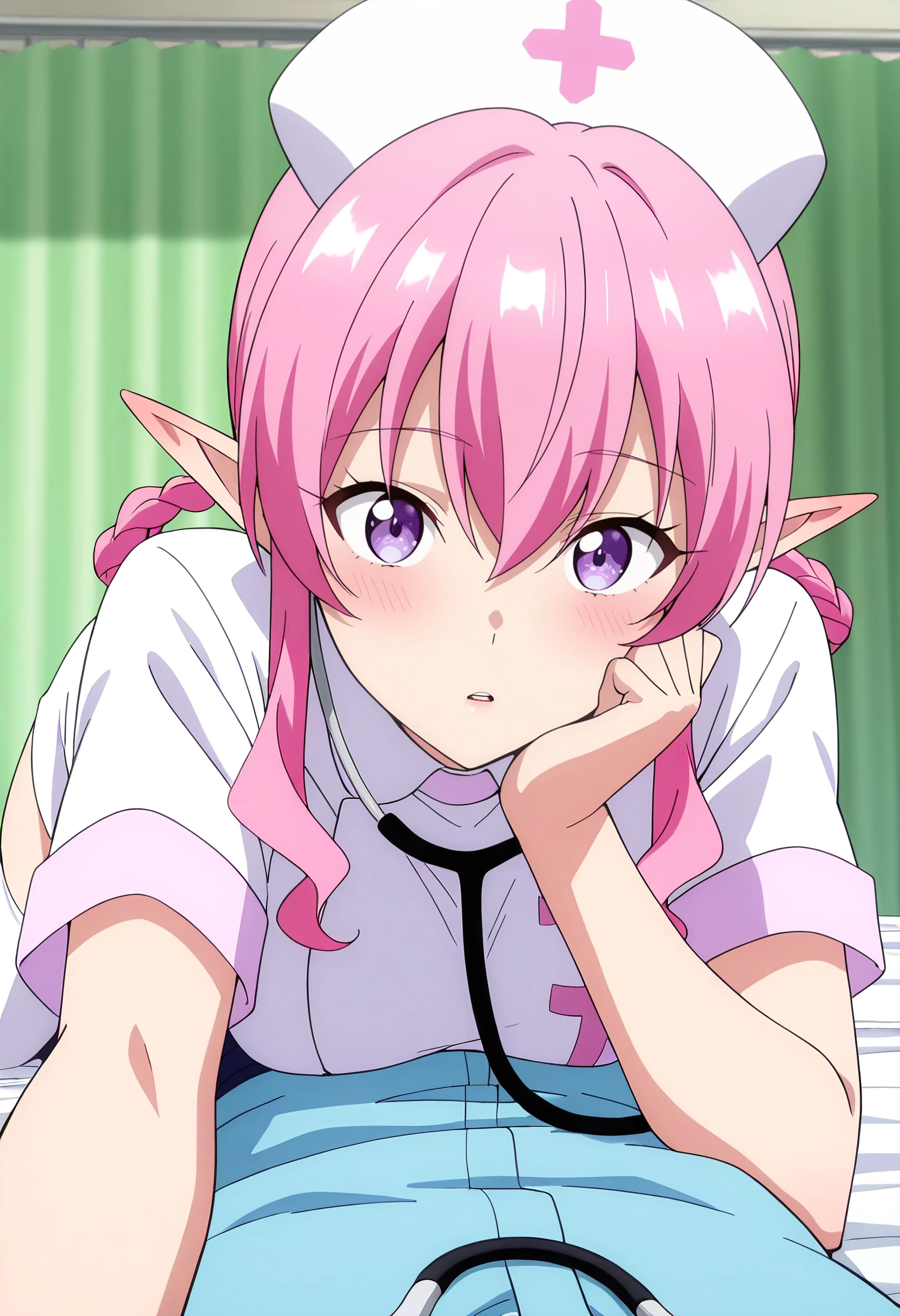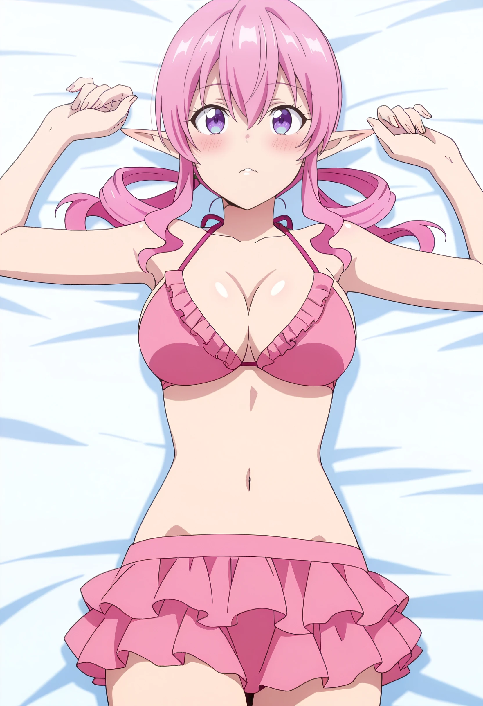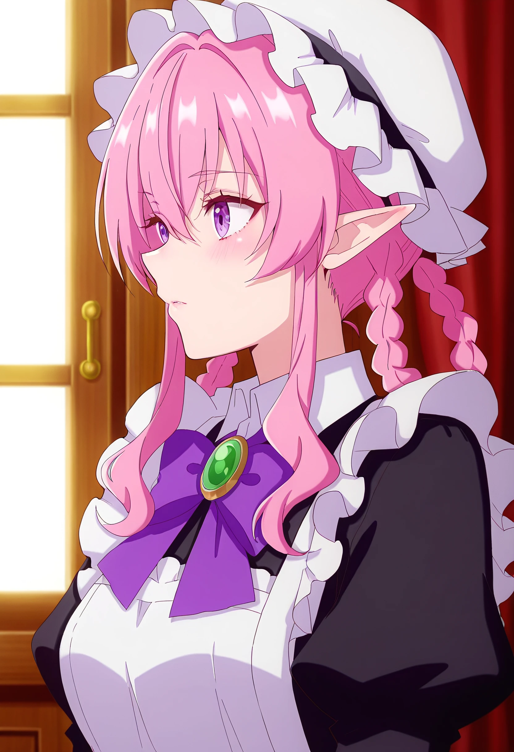BYNMina, pink hair, long hair, purple eyes, pointy ears, bangs, eyebrows visible through hair, long pointy ears, hair between eyes, elf,