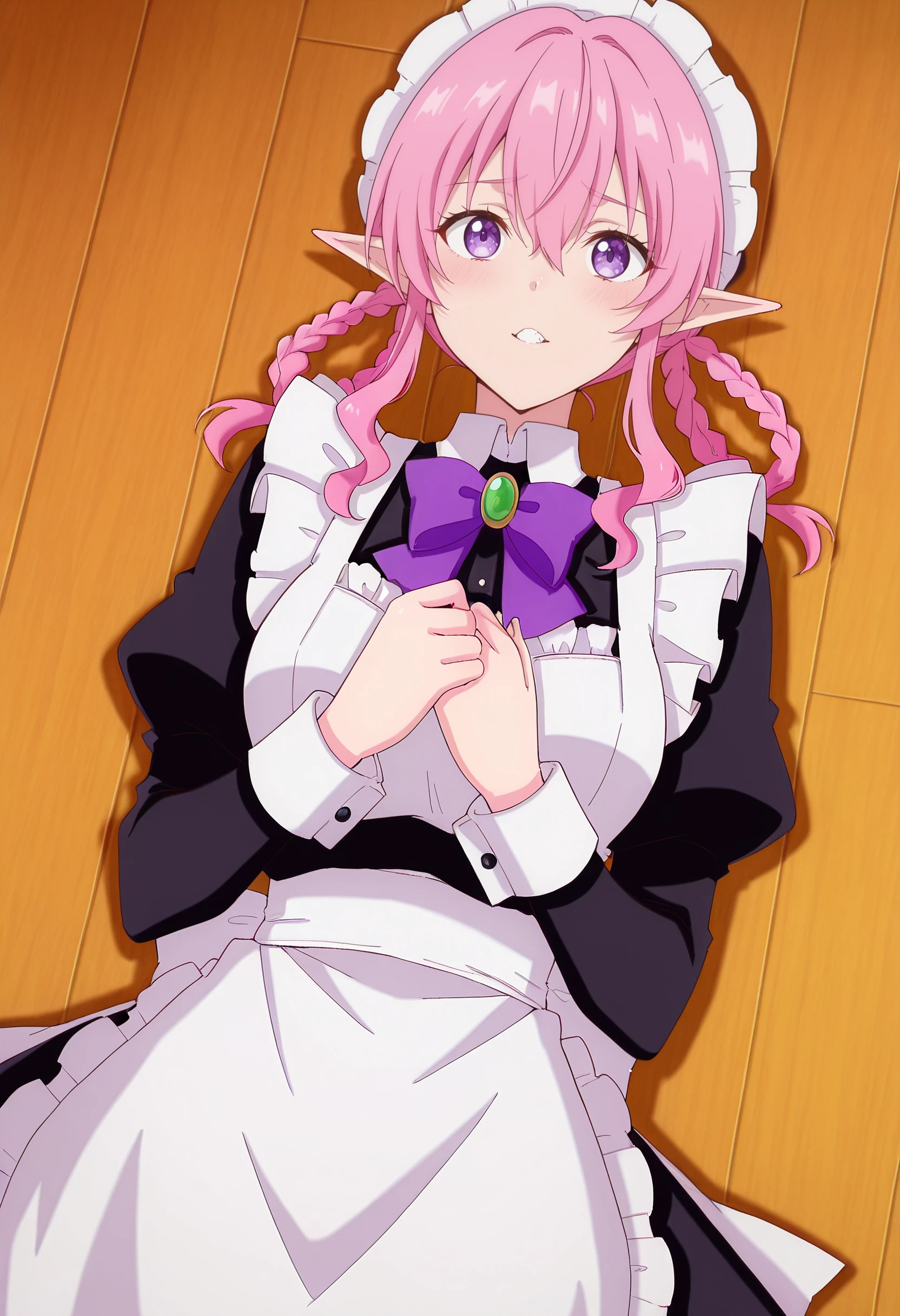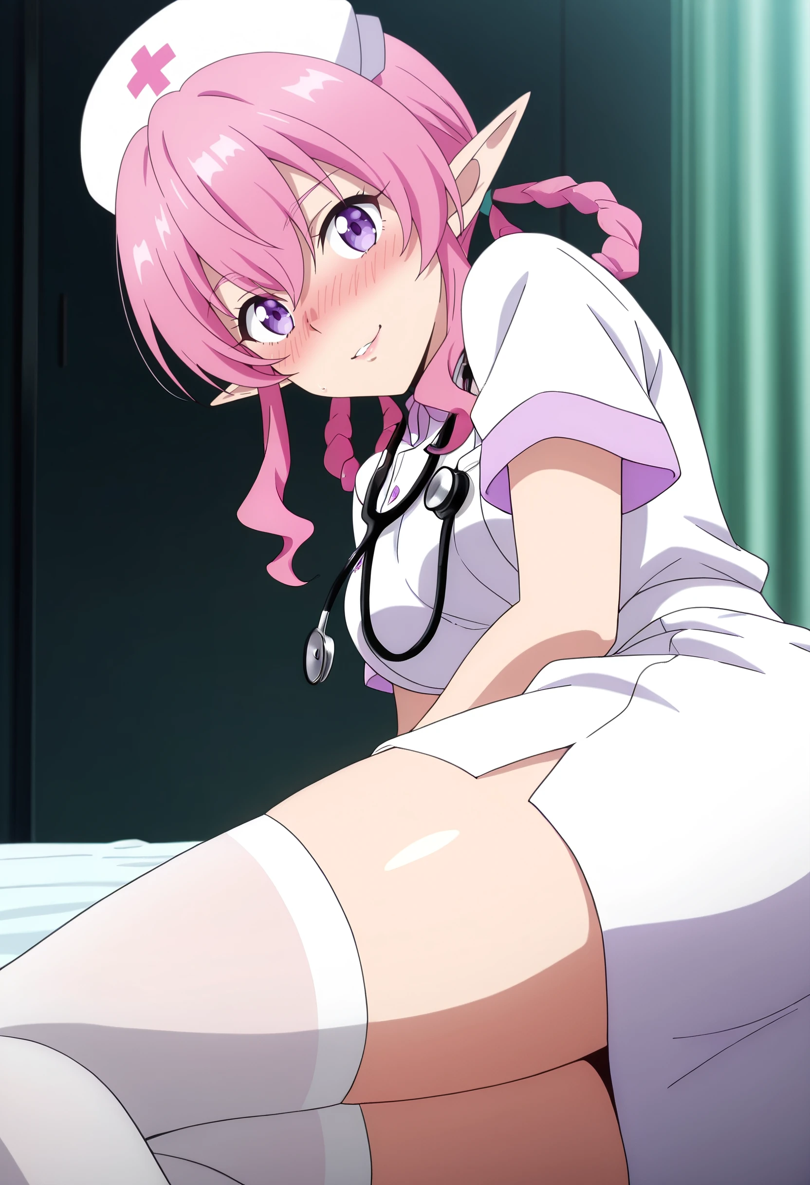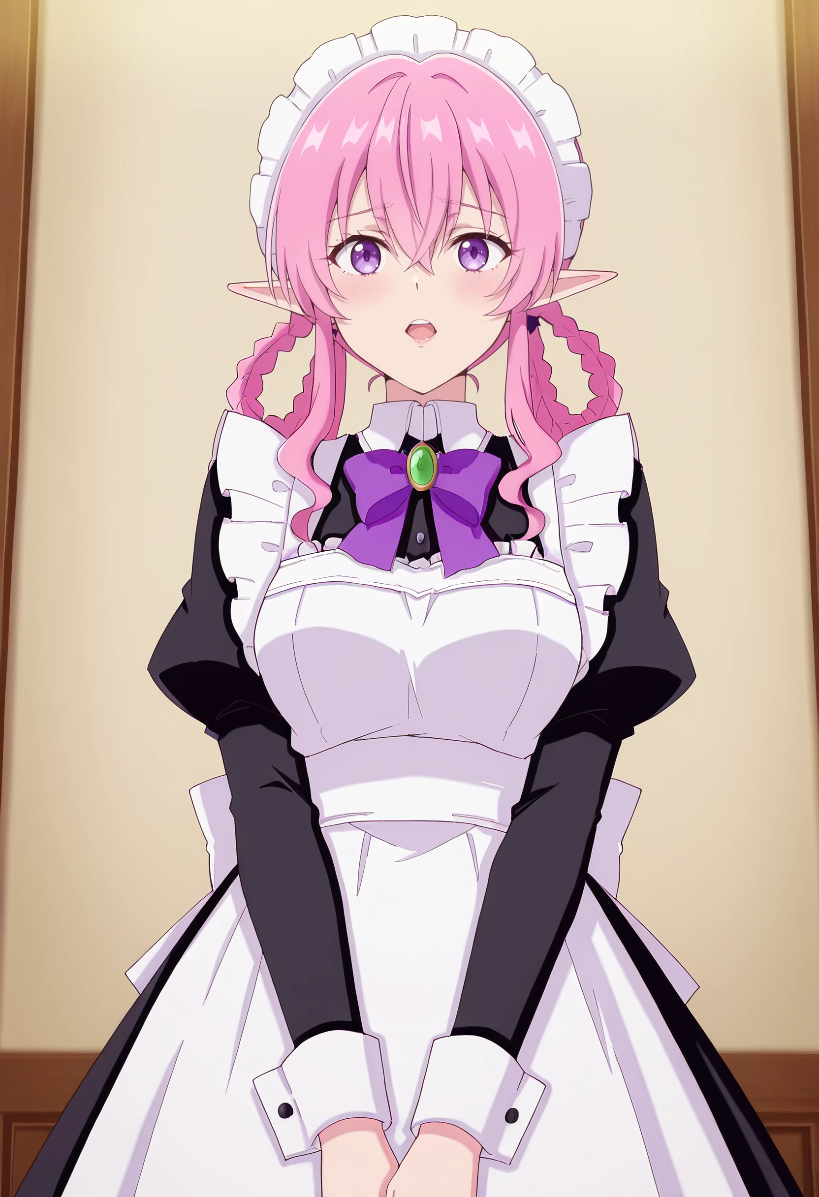 BYNMina, pink hair, long hair, purple eyes, pointy ears, bangs, eyebrows visible through hair, long pointy ears, hair between eyes, elf,