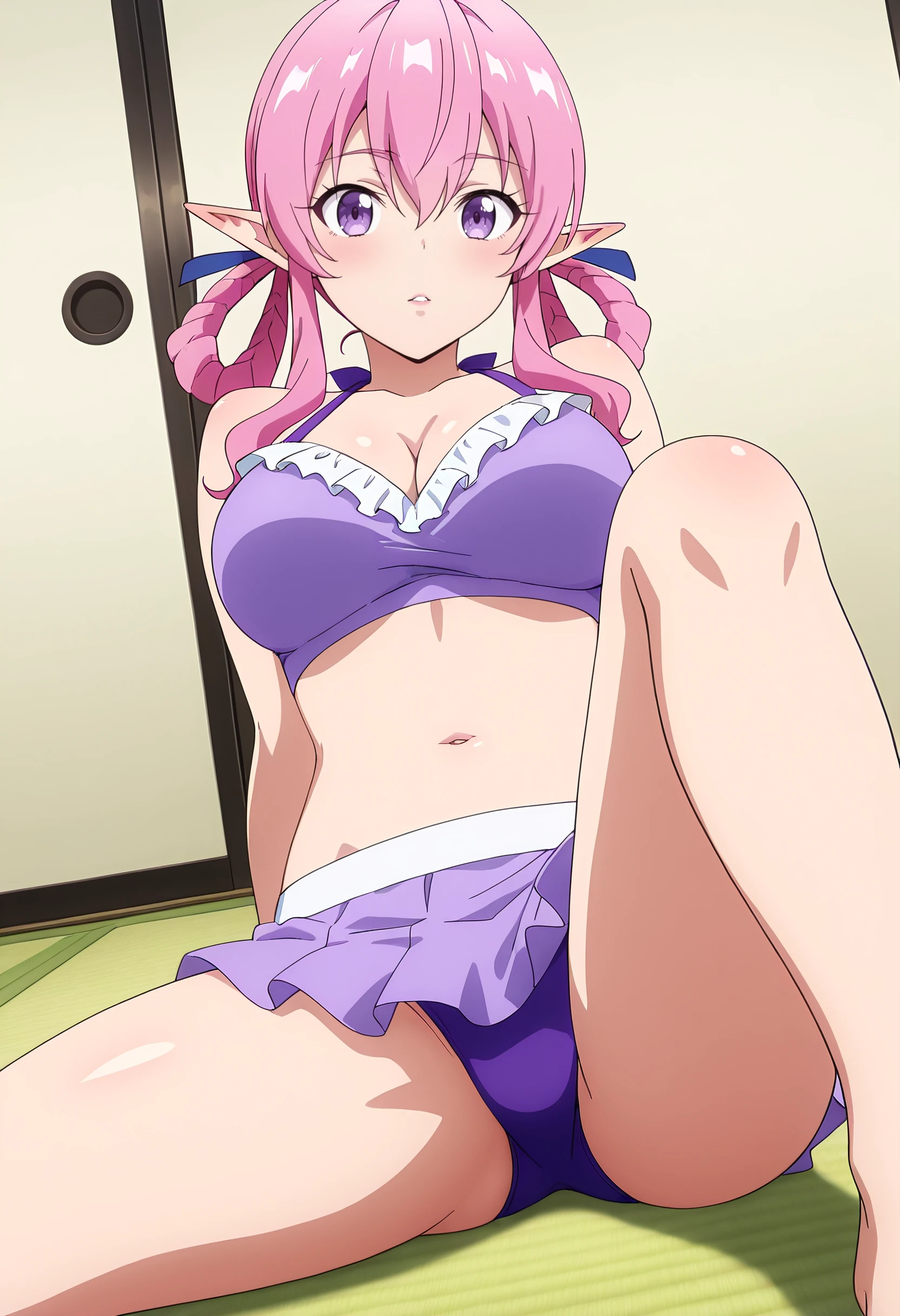 MinaSwimwear, navel, hair ribbon, ribbon, barefoot, midriff, purple skirt, shirt, skirt, tatami, crop top, bikini, bikini skirt, cleavage, frills, purple bikini, swimsuit,