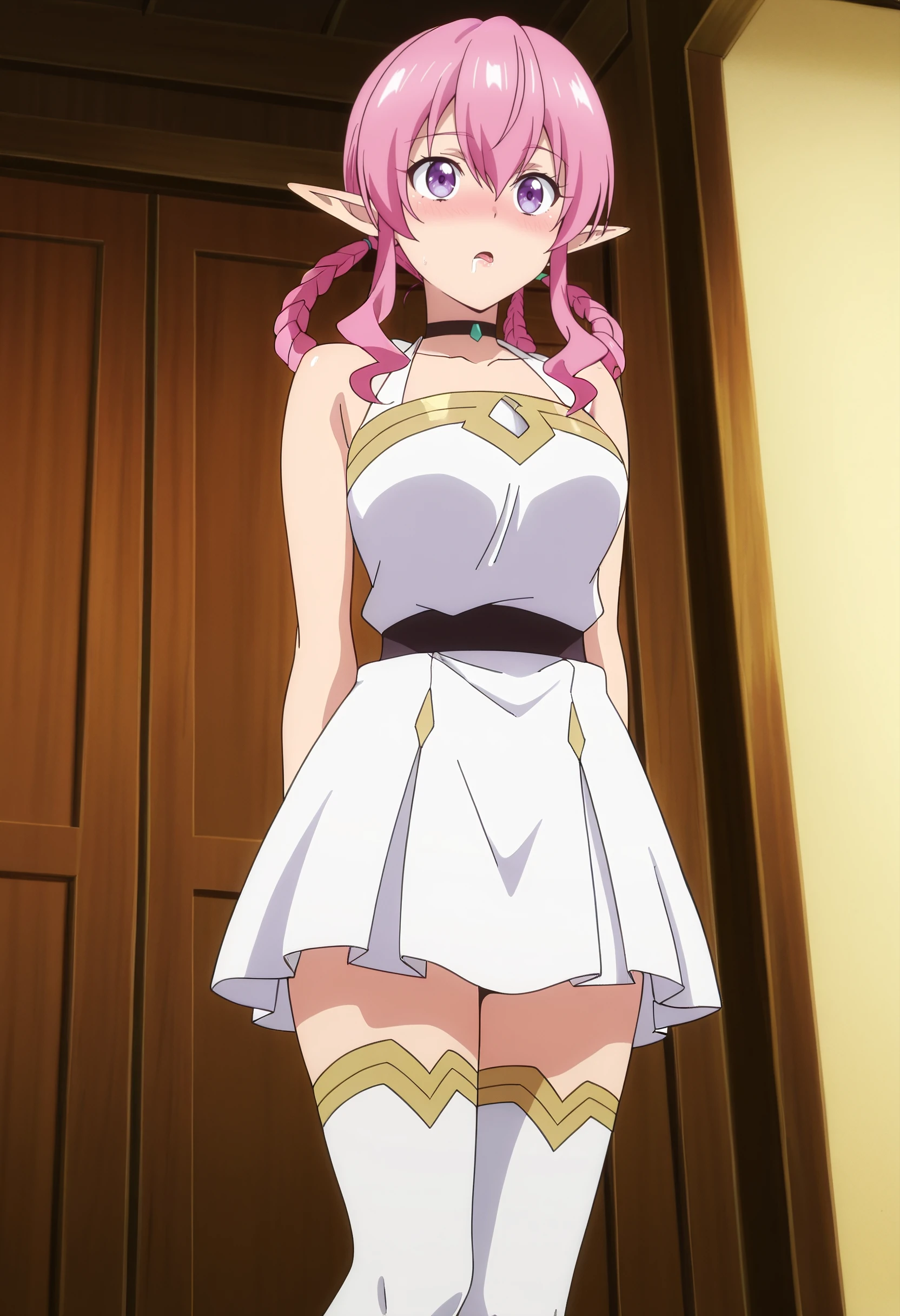 MinaDress, choker, black choker, collarbone, sleeveless, dress, skirt, bare shoulders, sidelocks, short sleeves, white skirt, sandals, thighhighs,