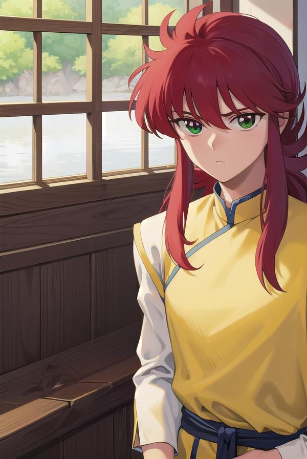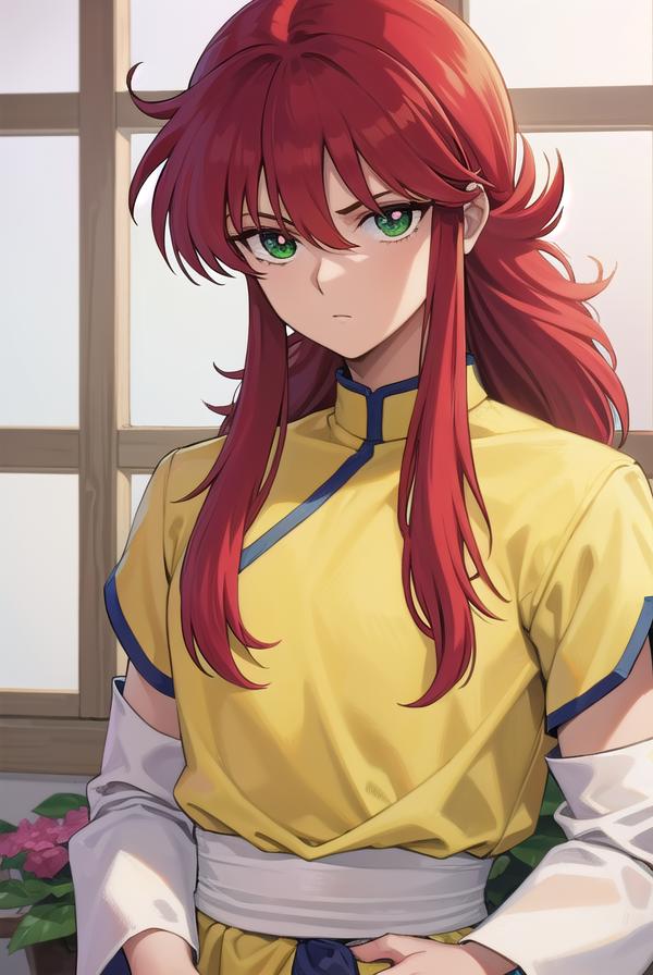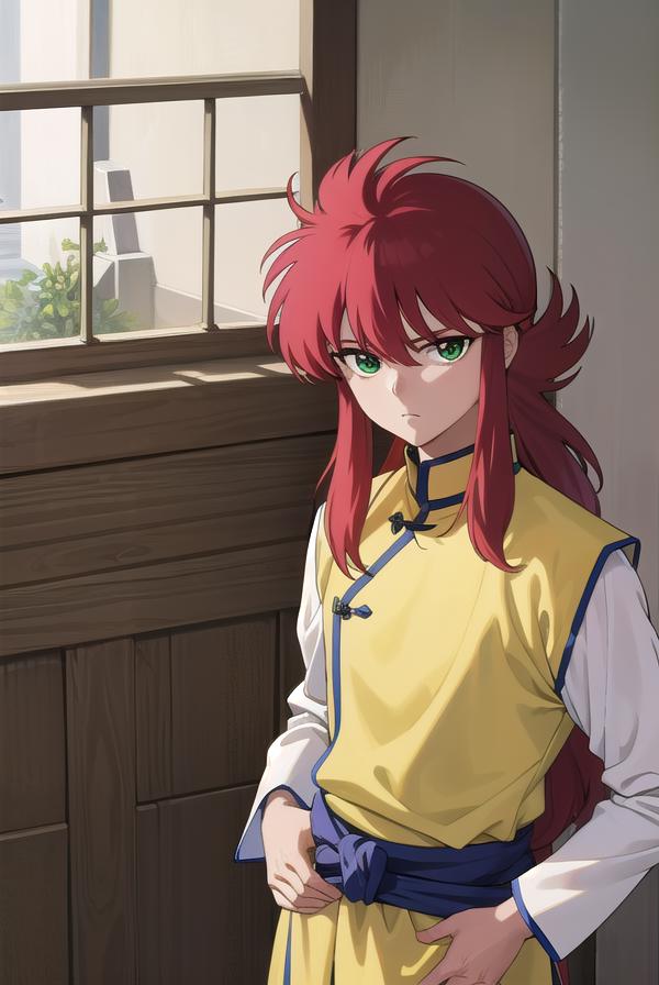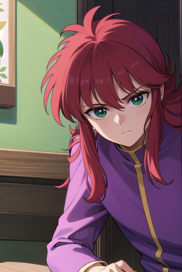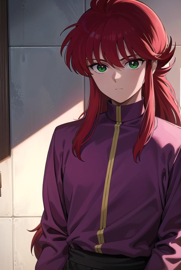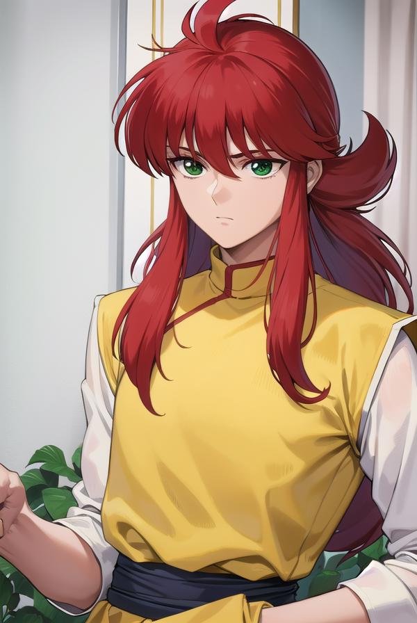 kurama, long hair, red hair, bangs, (green eyes:1.5), (retro artstyle:1.5), 1990s \(style\),
