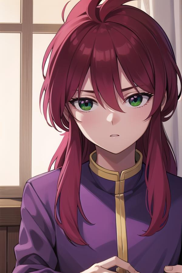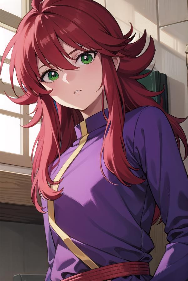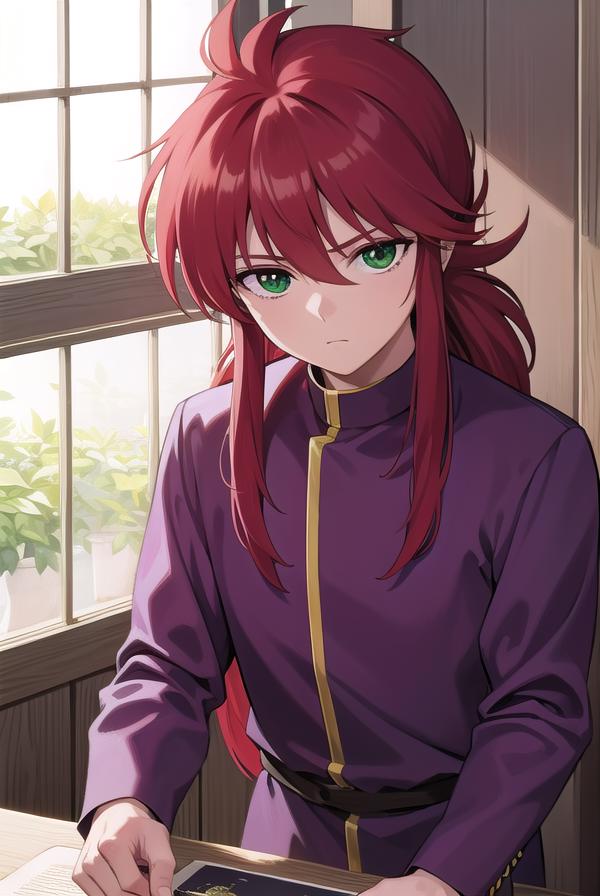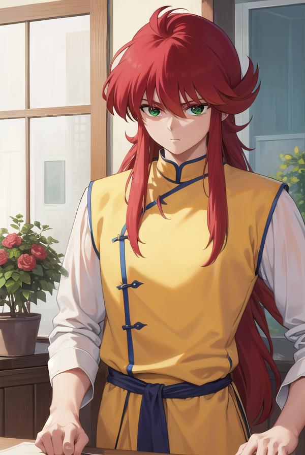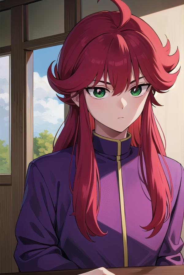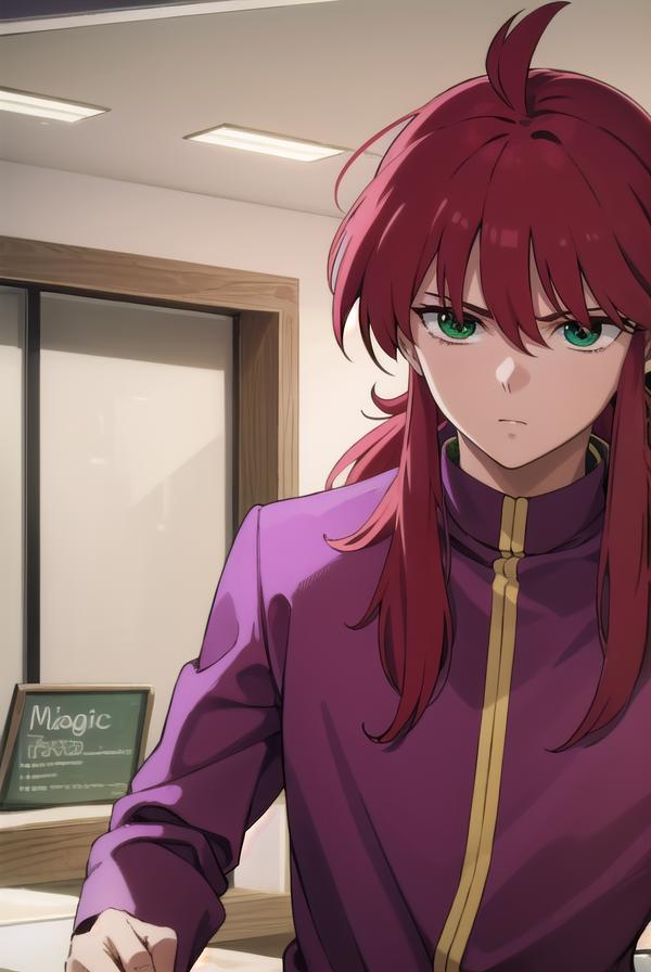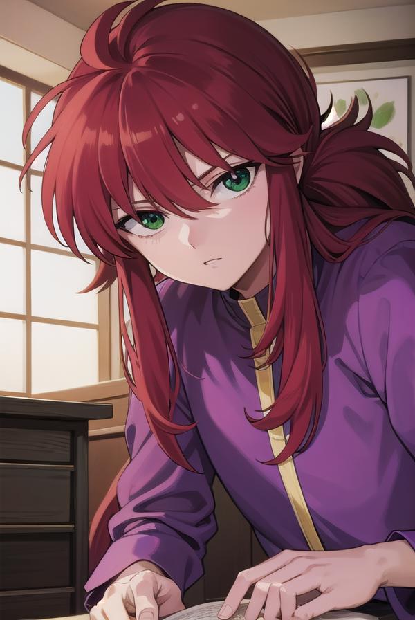 kurama, long hair, red hair, bangs, (green eyes:1.5), (retro artstyle:1.5), 1990s \(style\),