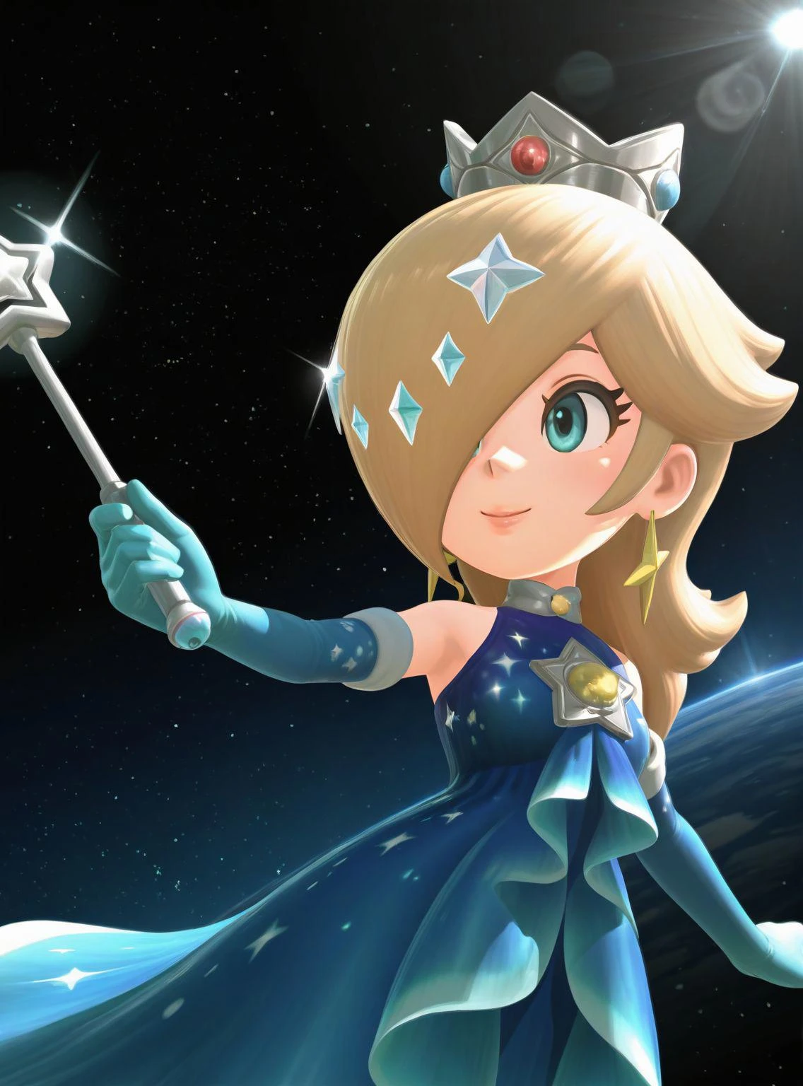 rosalinaauroramkw, aurora dress, blonde hair, hair over eye, crown, elbow gloves, crystals in hair, jewelry, star earrings