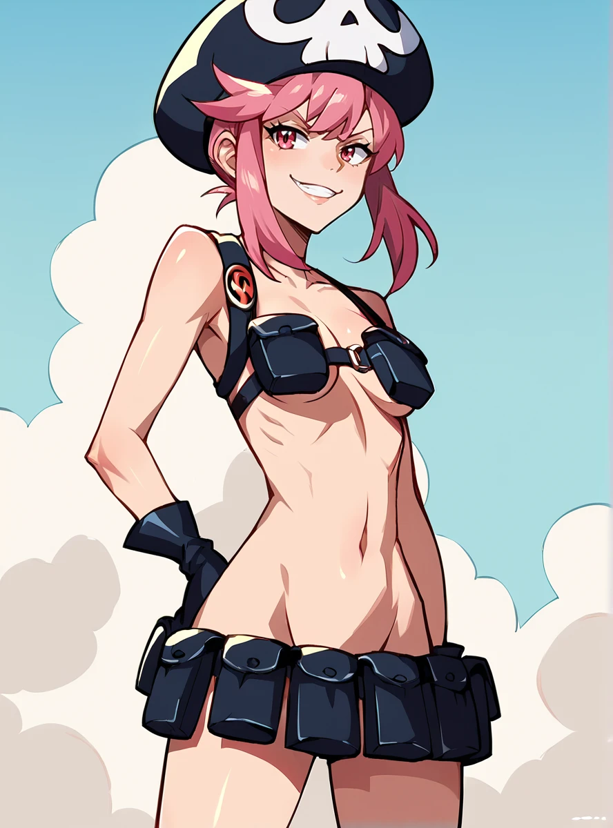 Nudist Beach: skull_print,revealing clothes, belt, black_belt black_gloves,