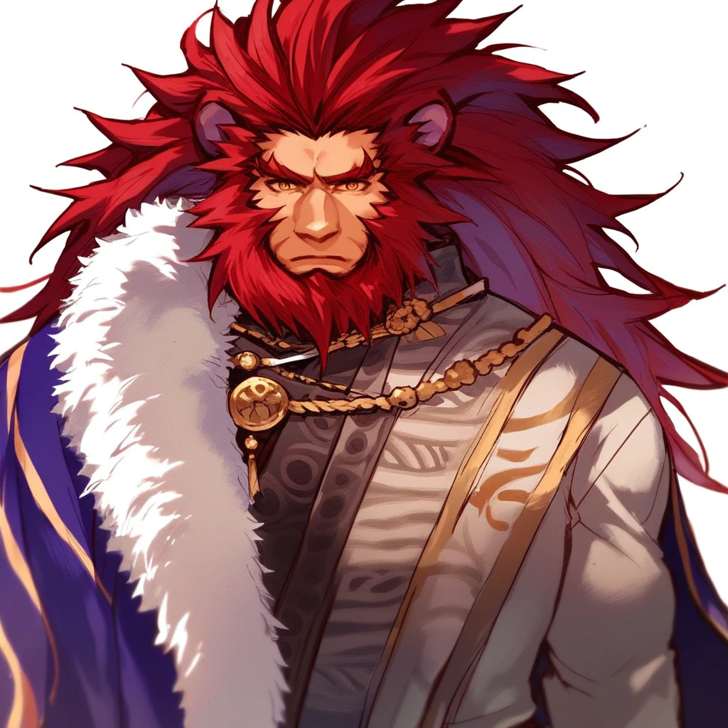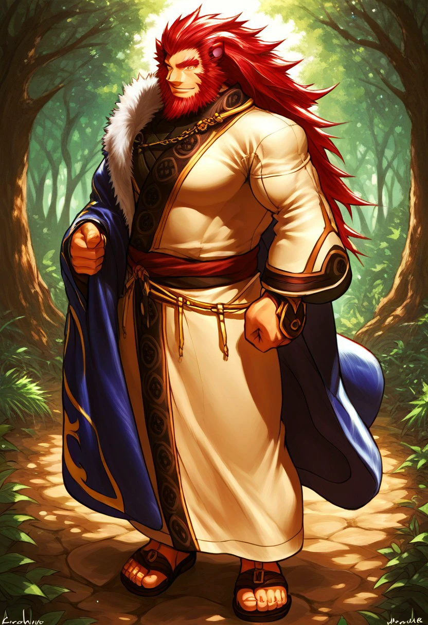 1boy, fe_caineghis, long red hair, red beard, lion ears, orange eyes, robe, sandals, blue cloak, muscular,