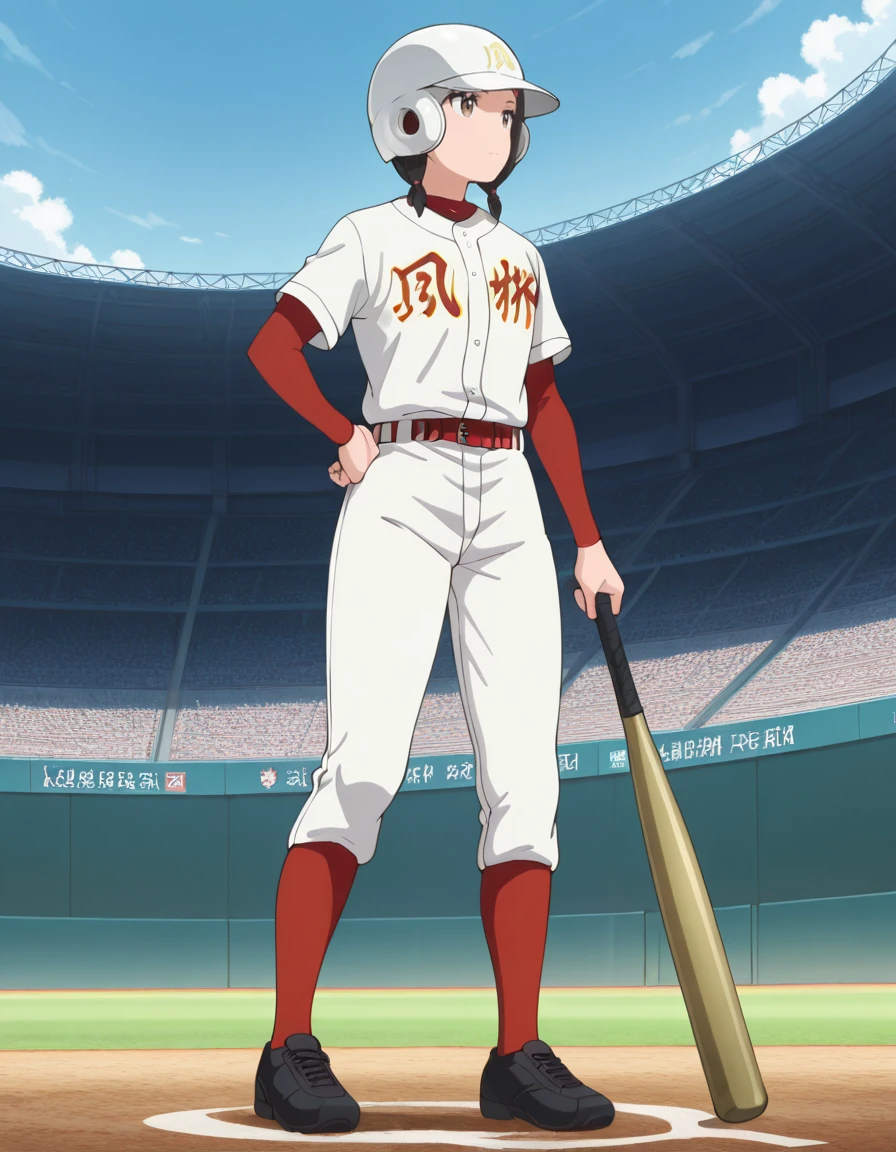 baseball uniform, white shirt, red undershirt, baseball jersey, short over long sleeves, layered sleeves, long sleeves, red belt, white pants, red socks, black sneakersOptional