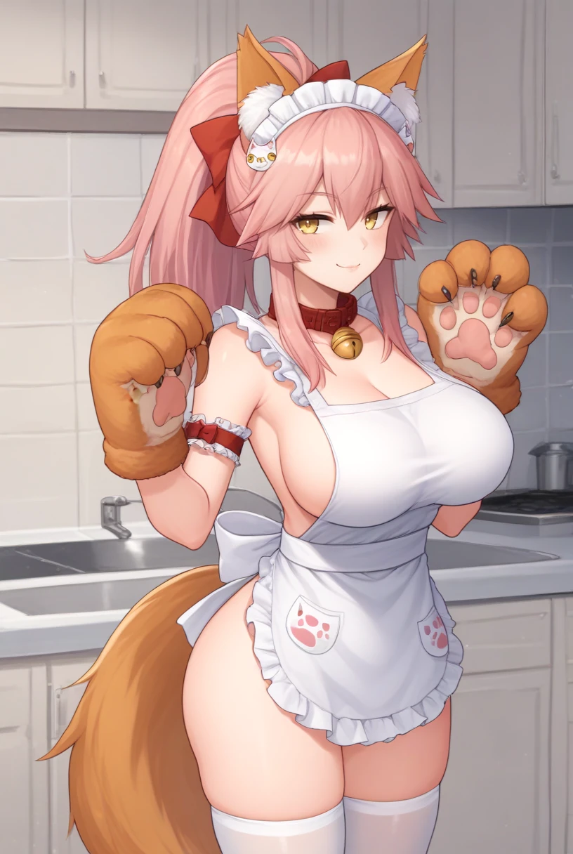 tamamo cat second, yellow eyes, pink hair, long hair, ponytail, animal ears, fox ears, animal ear fluff, fox tail, paw gloves, neck bell, collar, animal hands, maid, black dress, maid headdress, apron, white apron, red ribbon,white thighhighsCat third Ascension: