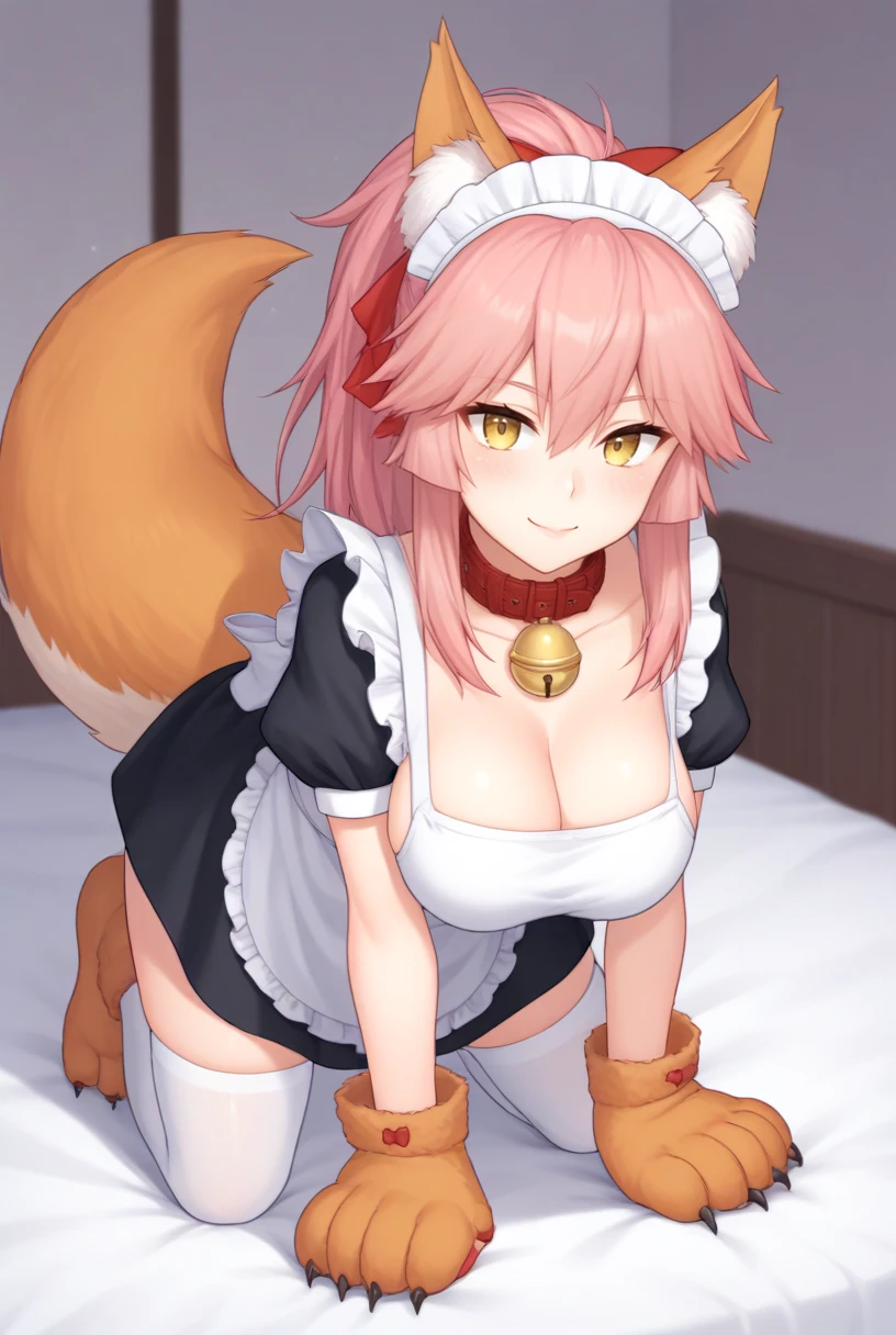 tamamo cat second, yellow eyes, pink hair, long hair, ponytail, animal ears, fox ears, animal ear fluff, fox tail, paw gloves, neck bell, collar, animal hands, maid, black dress, maid headdress, apron, white apron, red ribbon,white thighhighs